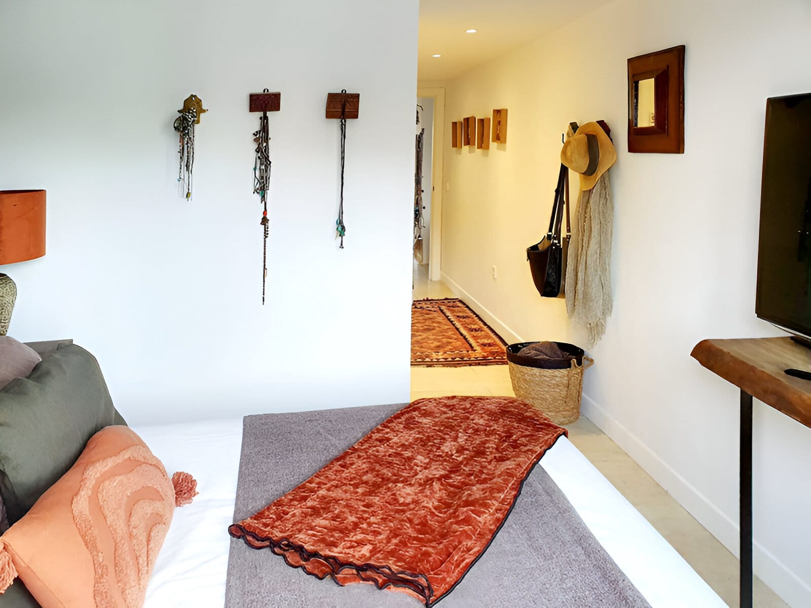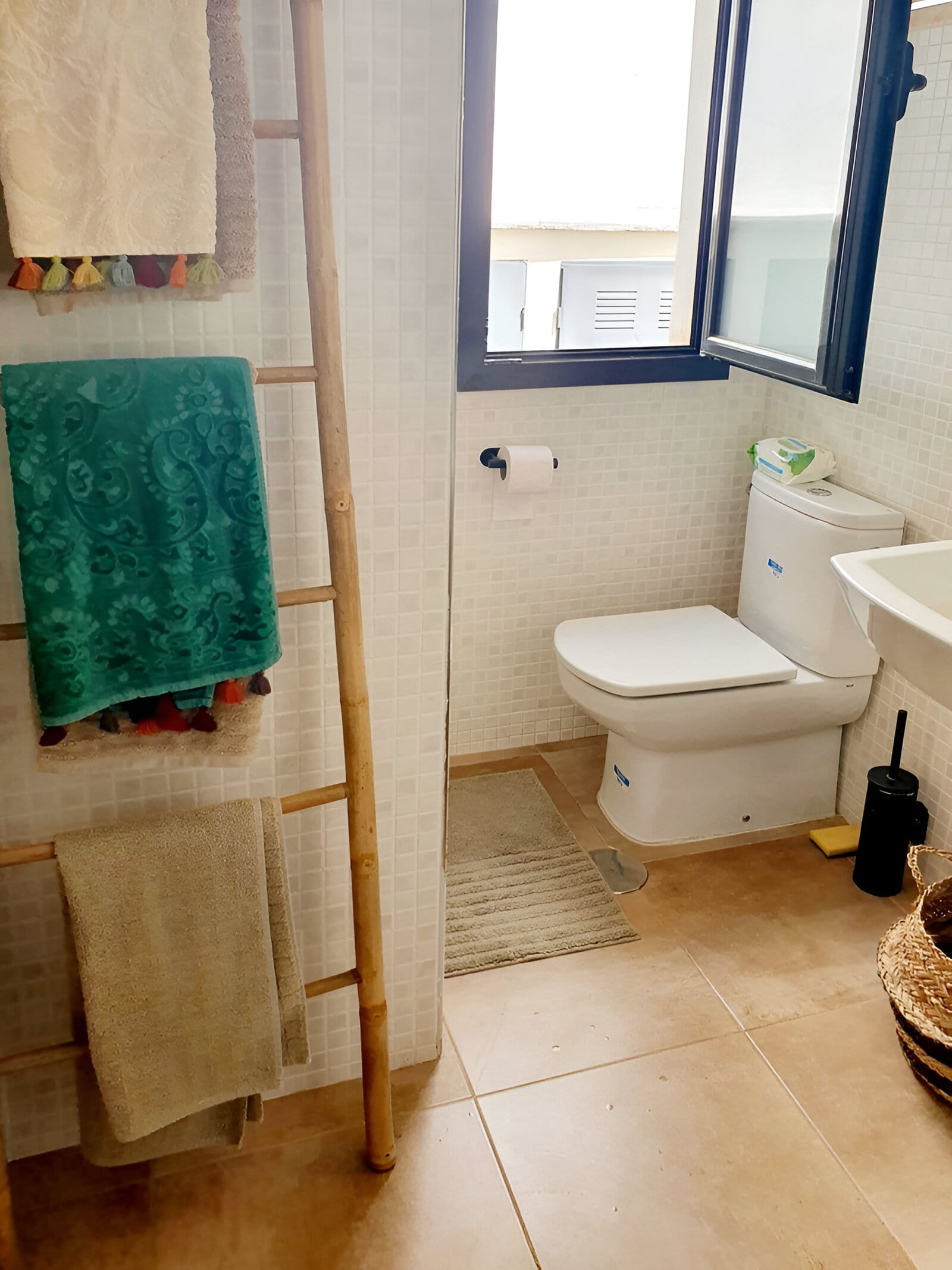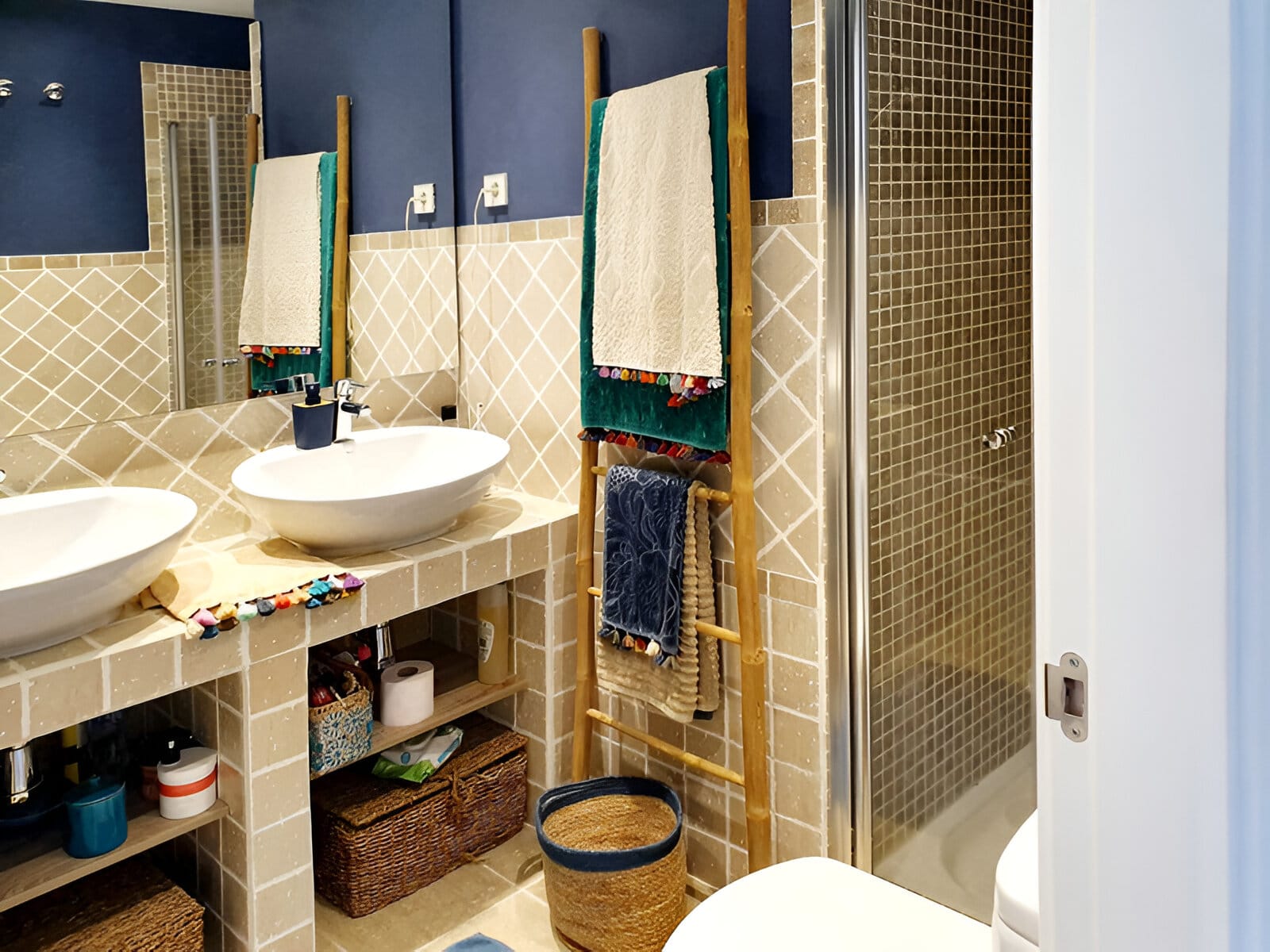 Apartamentul include și băi moderne, dotate cu accesorii și finisaje de înaltă calitate. Designul contemporan este completat de detalii artizanale, cum ar fi scărițe din lemn pentru prosoape și coșuri împletite, adăugând o notă rustică dar rafinată.