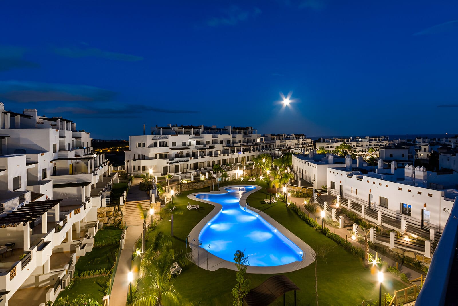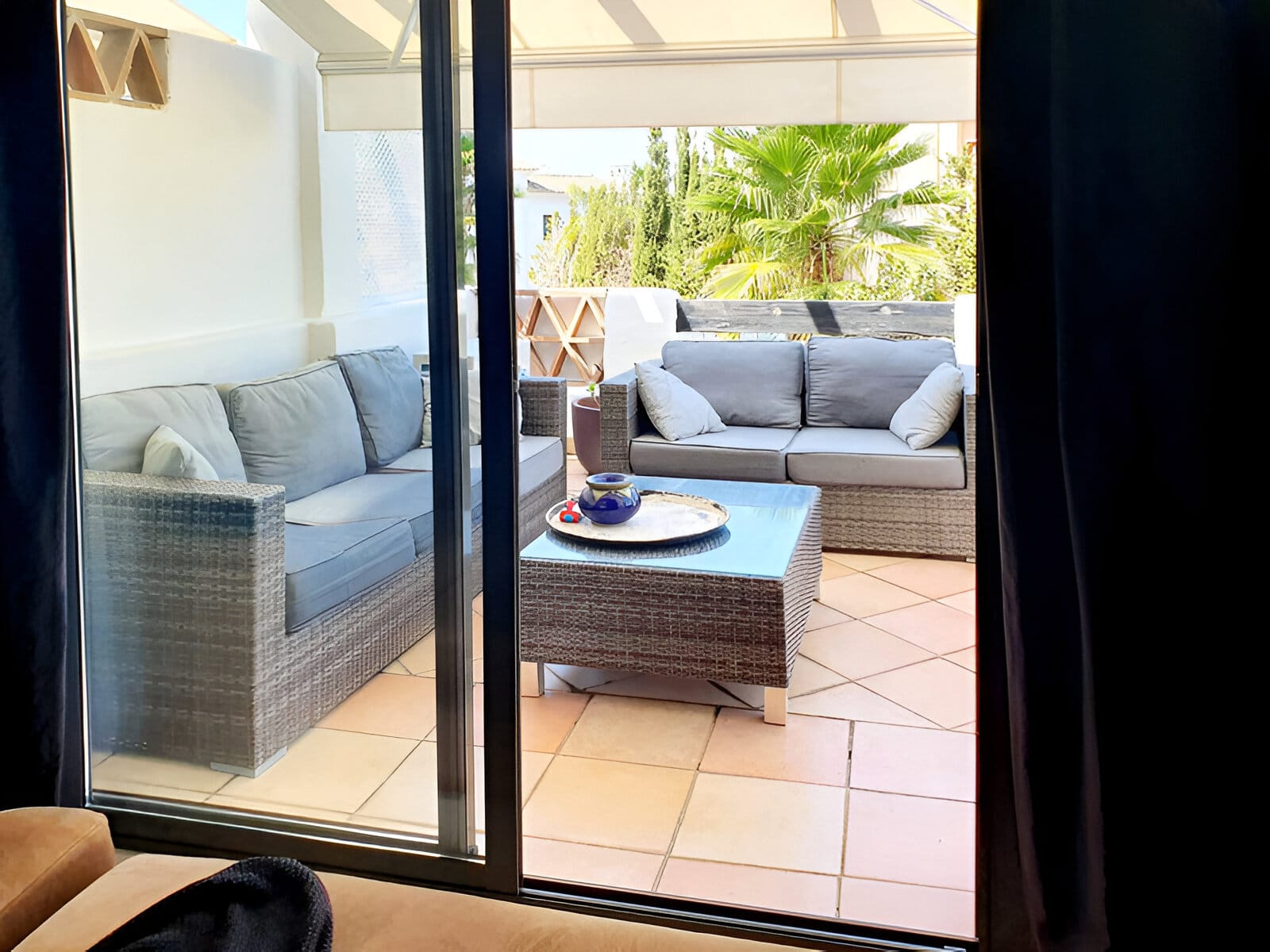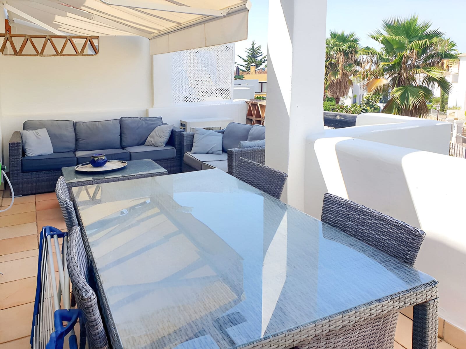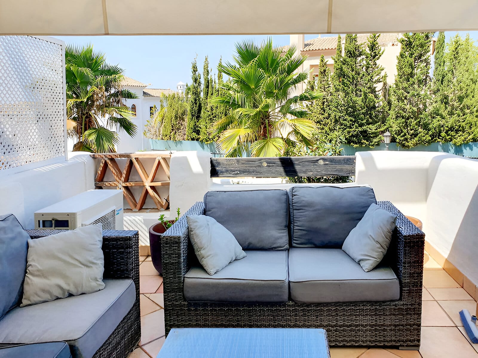 Terasă oferă priveliști superbe către grădinile înconjurătoare și casele albe tipice din Estepona. Vegetația luxuriantă și palmierii contribuie la atmosfera liniștită, transformând acest spațiu în una dintre atracțiile principale ale proprietății.