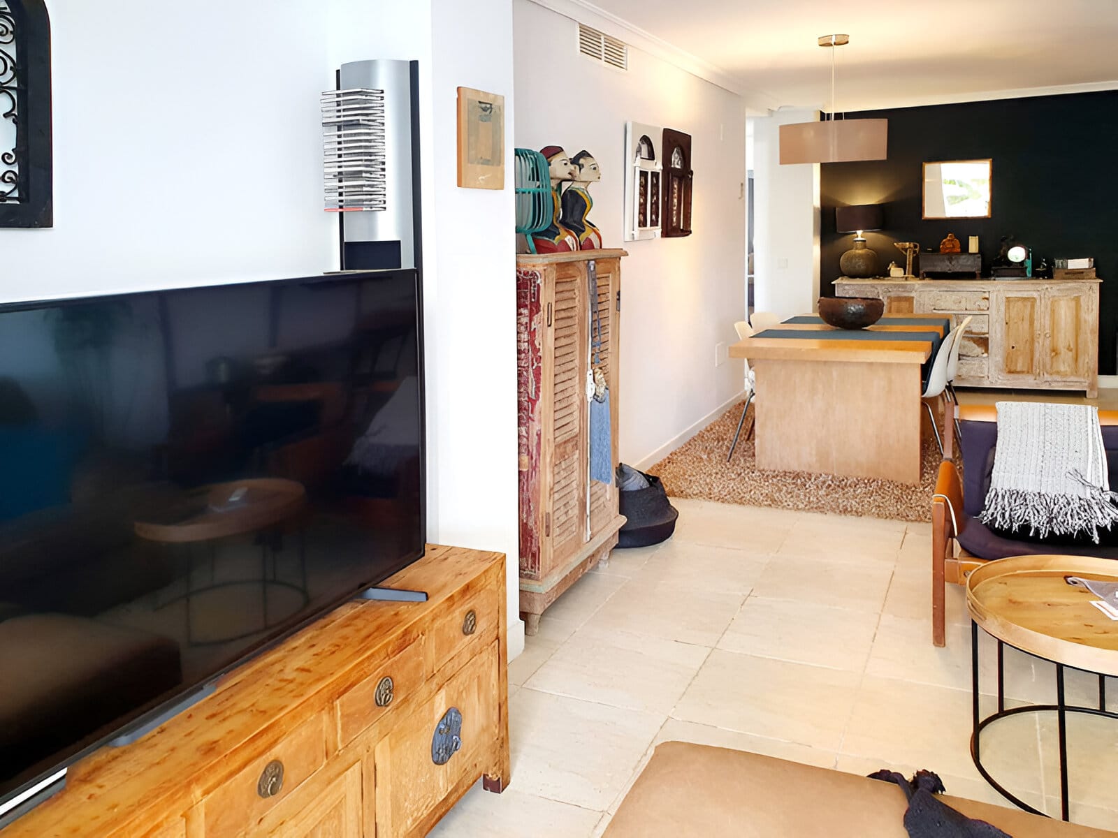 Această proprietate minunat proiectată din Sunset Golf se remarcă printr-un interior atent conceput, care combină confortul cu eleganța. La intrarea în apartament, sunteți întâmpinați de un living și o zonă de luat masa cu plan deschis, pline de lumină naturală. Livingul dispune de mobilier modern, inclusiv o canapea confortabilă, un televizor cu ecran plat și accente din lemn rustic, care creează o atmosferă caldă și primitoare.