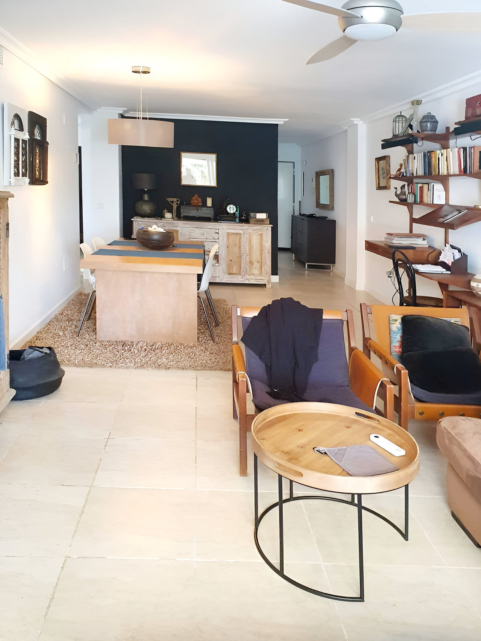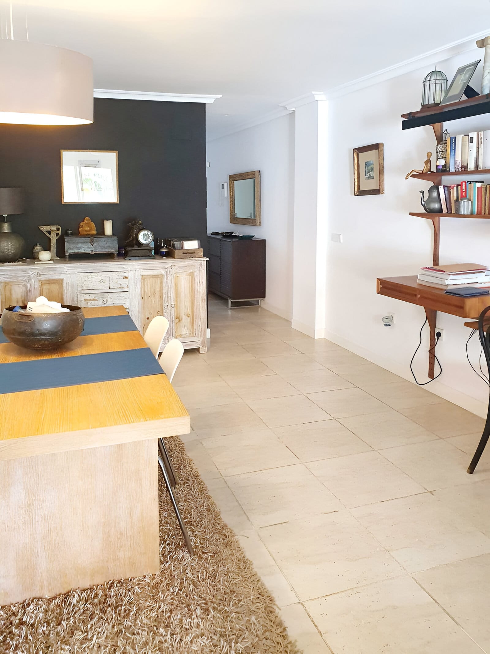 Zona de luat masa curge natural din spațiul de living, având o masă modernă de dining așezată pe un covor împletit, ideală atât pentru mesele casual, cât și pentru divertismentul oaspeților. Paleta de culori neutre din apartament este accentuată de mici detalii de culoare și modele, conferind spațiului o notă relaxată, dar sofisticată.
