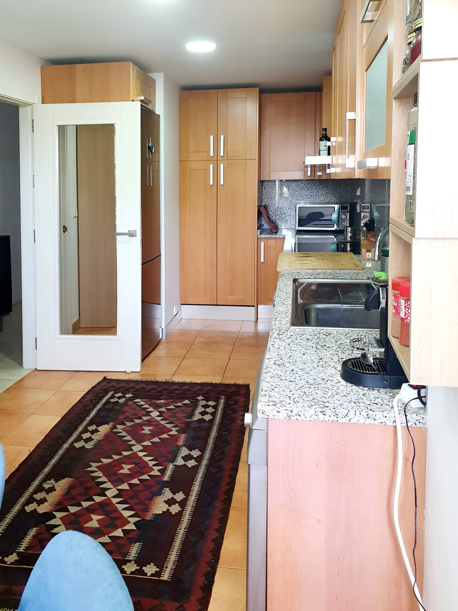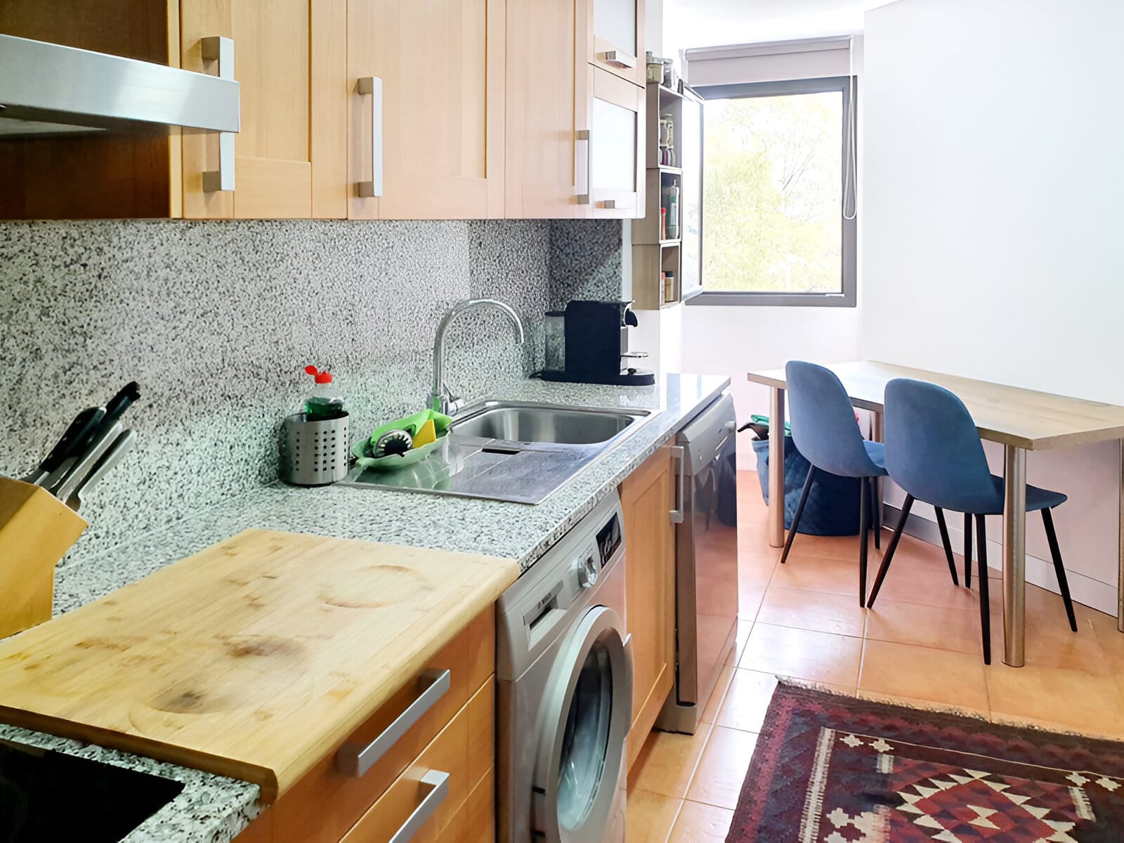 Bucătăria acestui apartament din Estepona este atât elegantă, cât și funcțională, având blaturi din granit lustruit, dulapuri din lemn și electrocasnice moderne. Fie că pregătiți o masă rapidă sau o cină gourmet, această bucătărie este echipată pentru a vă satisface toate nevoile. O masă de mic dejun, situată lângă fereastră, oferă locul perfect pentru a savura cafeaua de dimineață, admirând verdeața din exterior.
