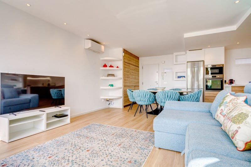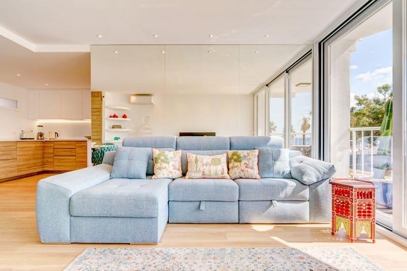 The apartment has 109 m² built and 108 m² usable, distributed in two bedrooms, one with a king-size bed and en-suite bathroom, and the other with two single beds. From both bedrooms, you can enjoy side views of the sea. The living room is spacious and bright, thanks to the large windows that allow natural light to enter and create a welcoming atmosphere. The kitchen is fully equipped, so you can prepare your favorite dishes without worries.