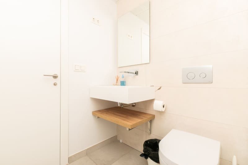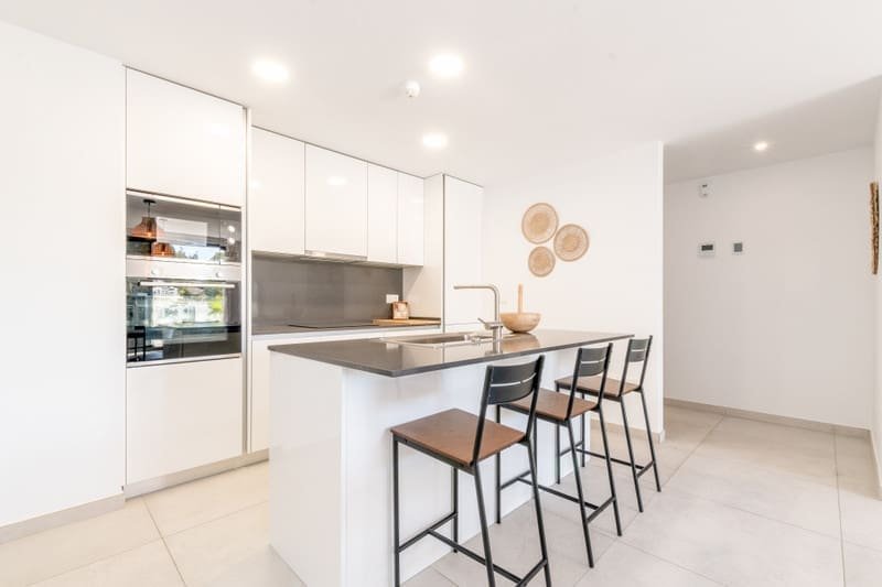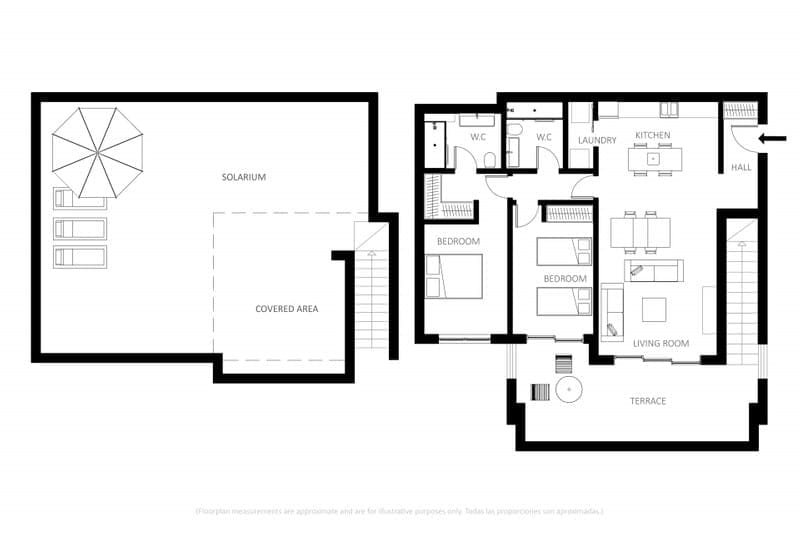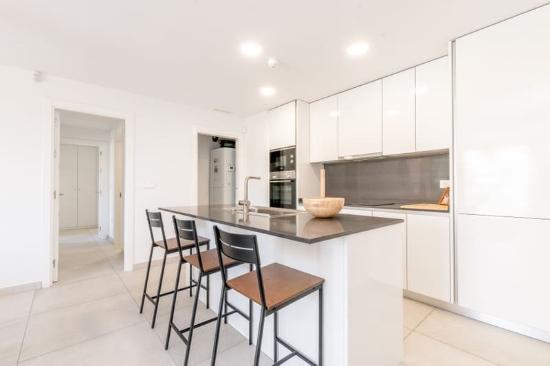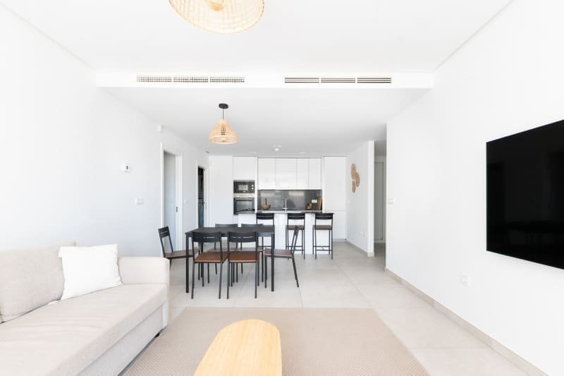 La intrarea în penthouse, veți fi întâmpinați de o zonă de locuit spațioasă și luminoasă, cu ferestre mari de la podea până la tavan care inundă spațiul cu lumină naturală. Layout-ul deschis conectează perfect zonele de living, dining și bucătărie, creând un spațiu versatil perfect atât pentru relaxare, cât și pentru distracție. Proprietatea dispune de o bucătărie de ultimă generație, echipată cu aparate moderne și spațiu amplu de depozitare. Băile elegante sunt dotate cu accesorii de top și finisaje luxoase. Cele două dormitoare de dimensiuni generoase oferă un refugiu liniștit, unul dintre ele cu baie proprie. Una dintre caracteristicile deosebite ale acestui penthouse luxos este solarium-ul său extins. Această terasă privată de pe acoperiș oferă vederi panoramice uluitoare asupra terenului de golf din jur și permite rezidenților să se bucure de soarele mediteranean în intimitate totală. Cu mult spațiu pentru mobilier de exterior și distracții, solarium-ul este locul perfect pentru relaxare și destindere.