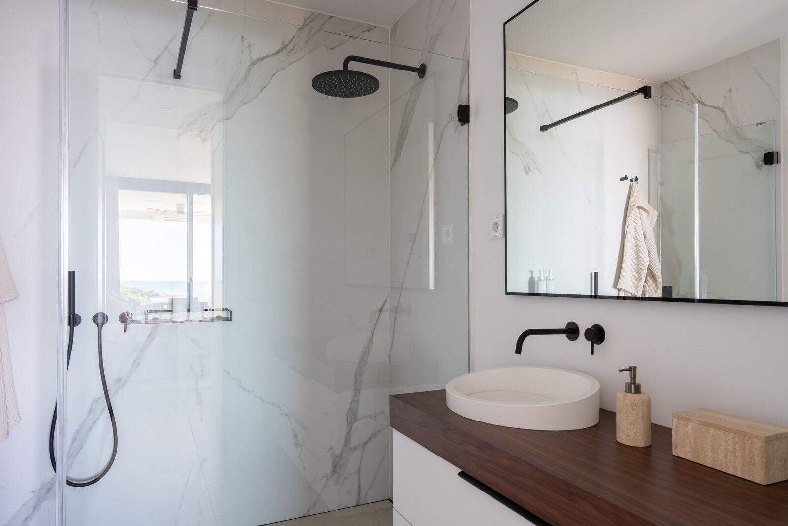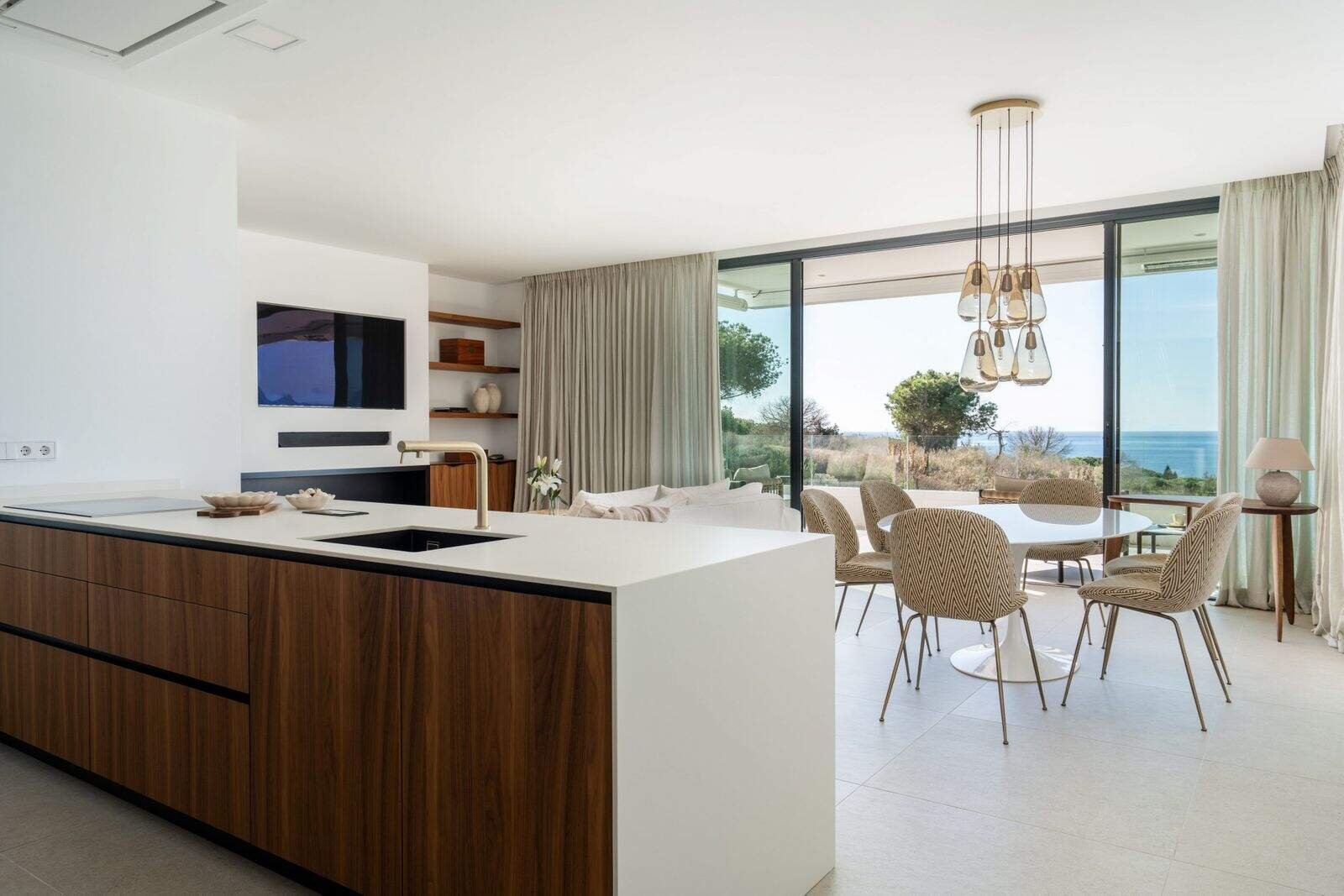 Acest apartament rafinat cu 3 dormitoare este scăldat în lumina soarelui de la răsărit până la apus și oferă apusuri de neuitat în fiecare seară. Zona de living cu plan deschis dispune de uși din sticlă de la podea până la tavan, invitând lumina naturală să pătrundă în timp ce încadrează vederi panoramice asupra mării și munților ca o operă de artă vie.