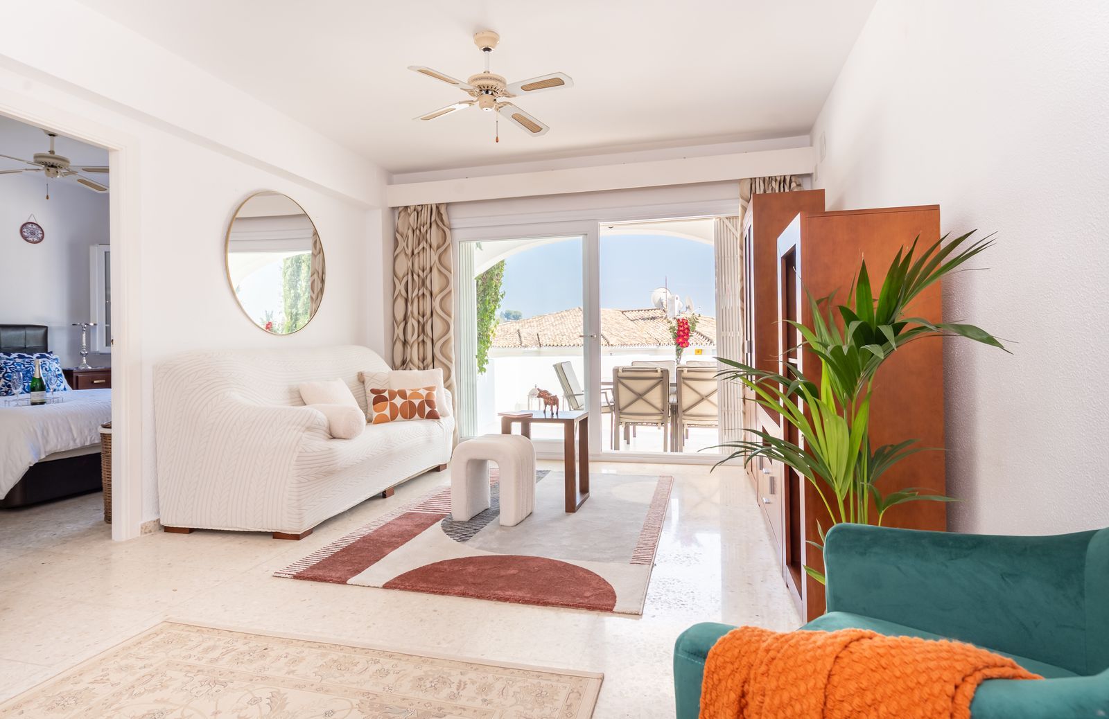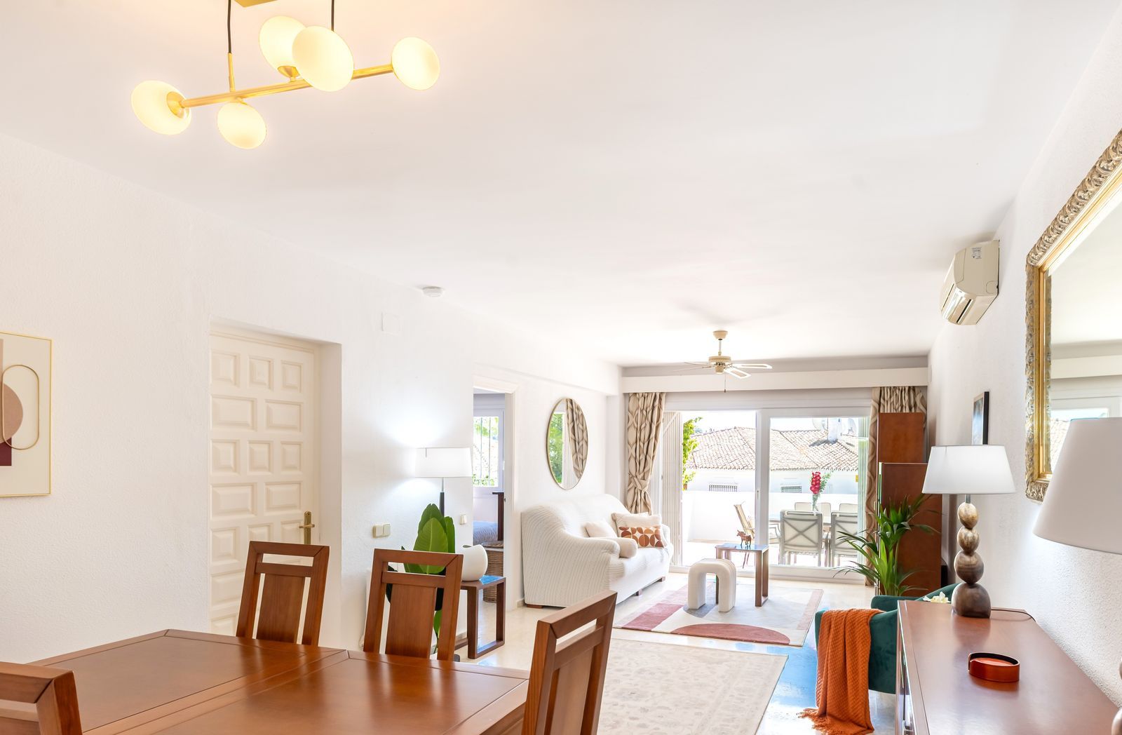 Salonul dispune de feronerie de tip fereastră din perete în perete, oferind vederi către exquisitele grădini tropicale andaluziene și acces la o terasă exterioară complet renovată, închisă și deschisă, cu suficient spațiu pentru mese, bronzat și relaxare. O grădină suplimentară poate fi accesată din terasă, cu trepte care duc direct la garajul proprietății pentru 1 mașină, cu un concourse exterior pentru parcare a unei a doua mașini.