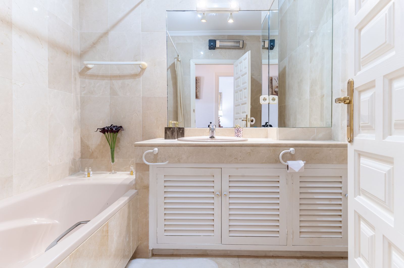 Un lung coridor privat, accesat din salon, duce la o baie luxoasă, renovată, din marmură de crem deschis, cu cadă și unitate de vanity din marmură.