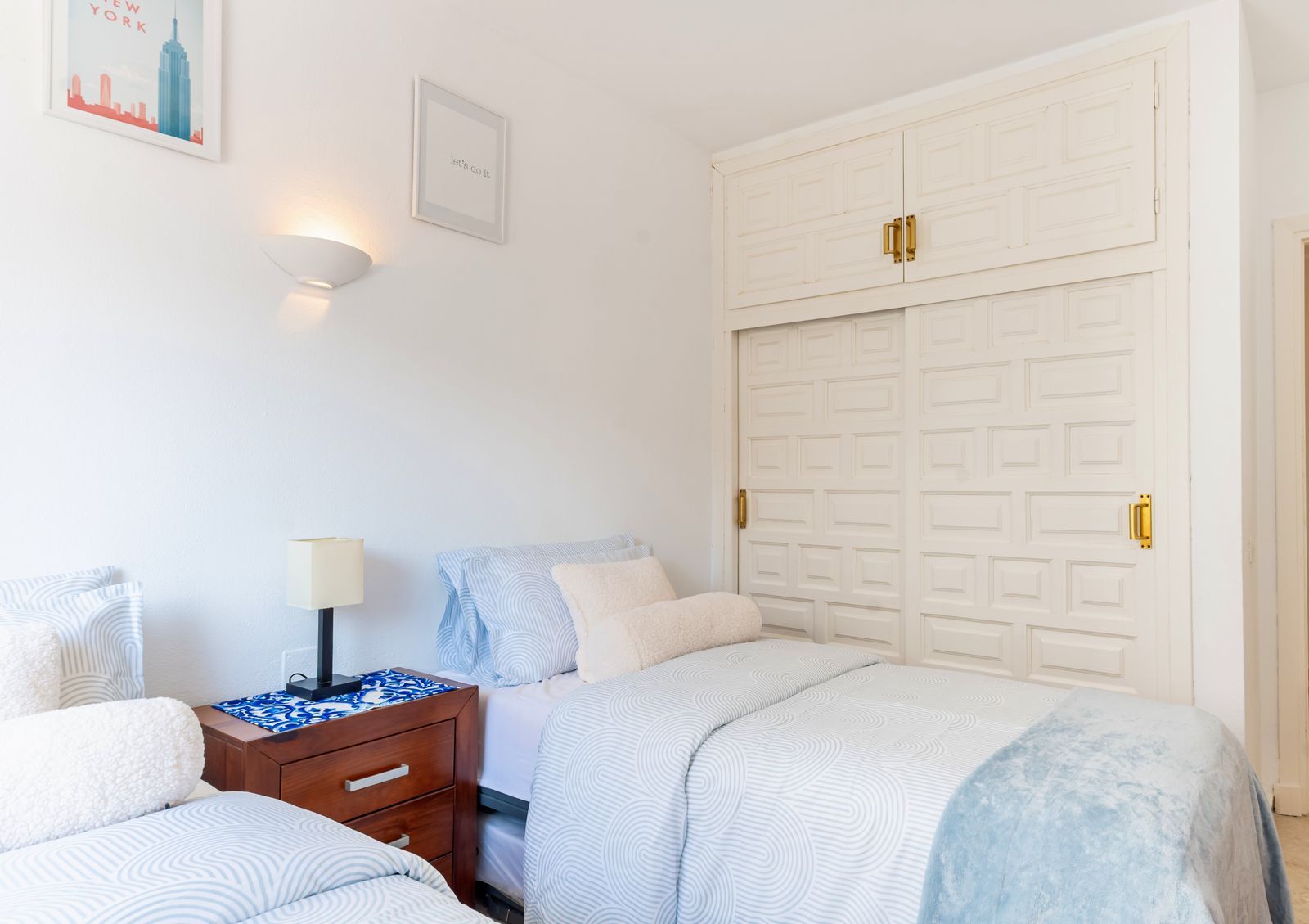Dormitorul dublu pentru oaspeți, adiacent, este dotat cu 2 paturi single, dulapuri cu panouri duble și mobilier din mahon, având vederi către grădinile cu palmieri pline de Bougainvillea.