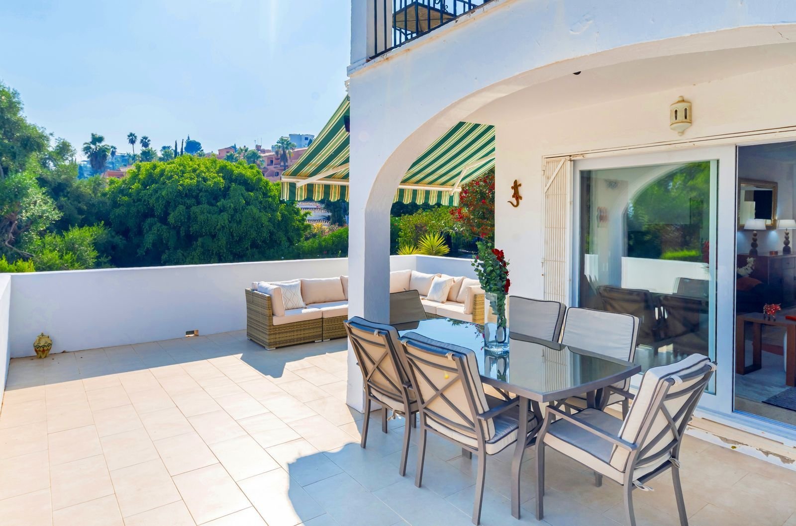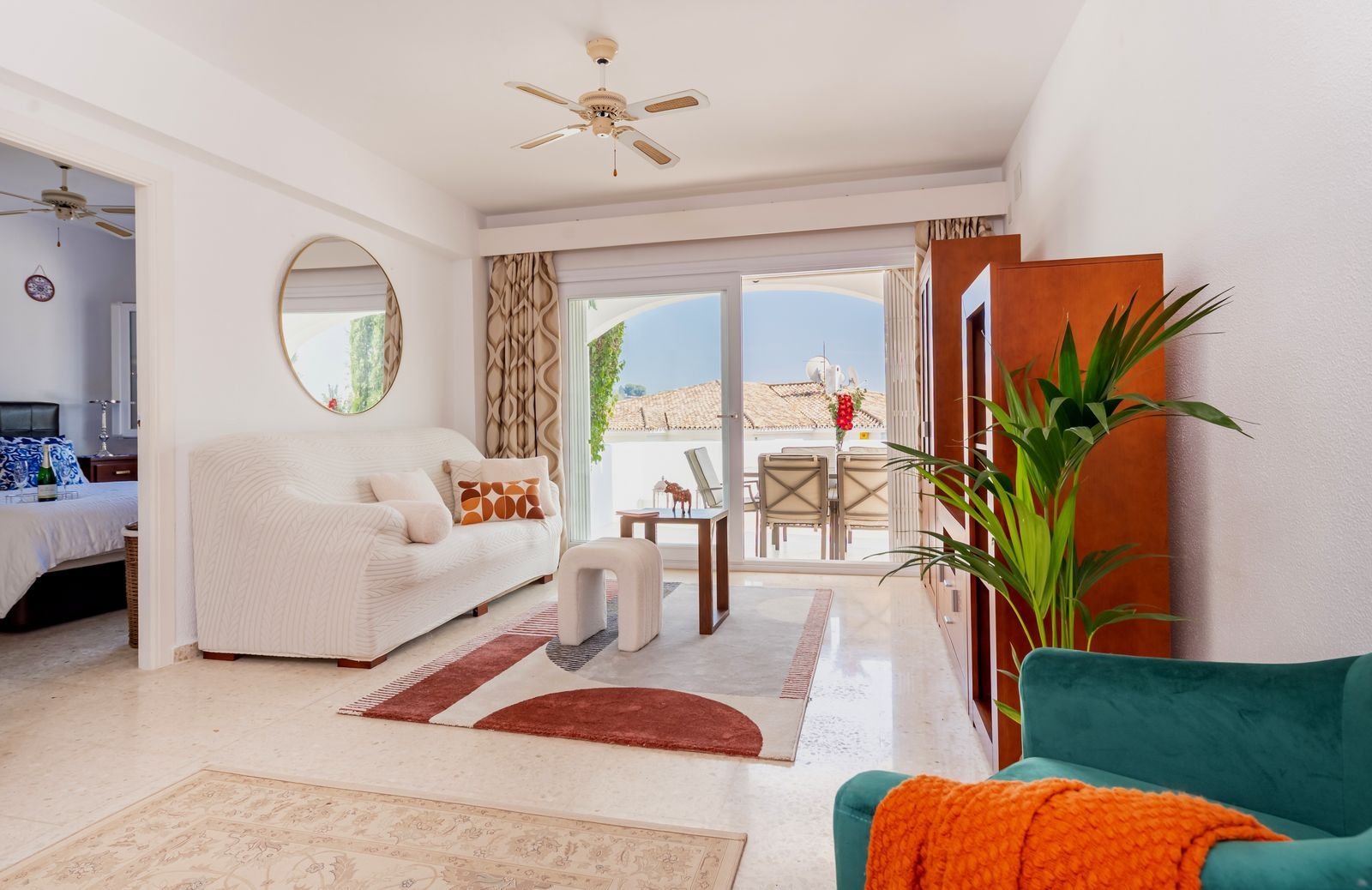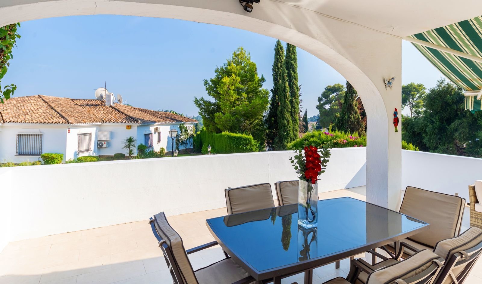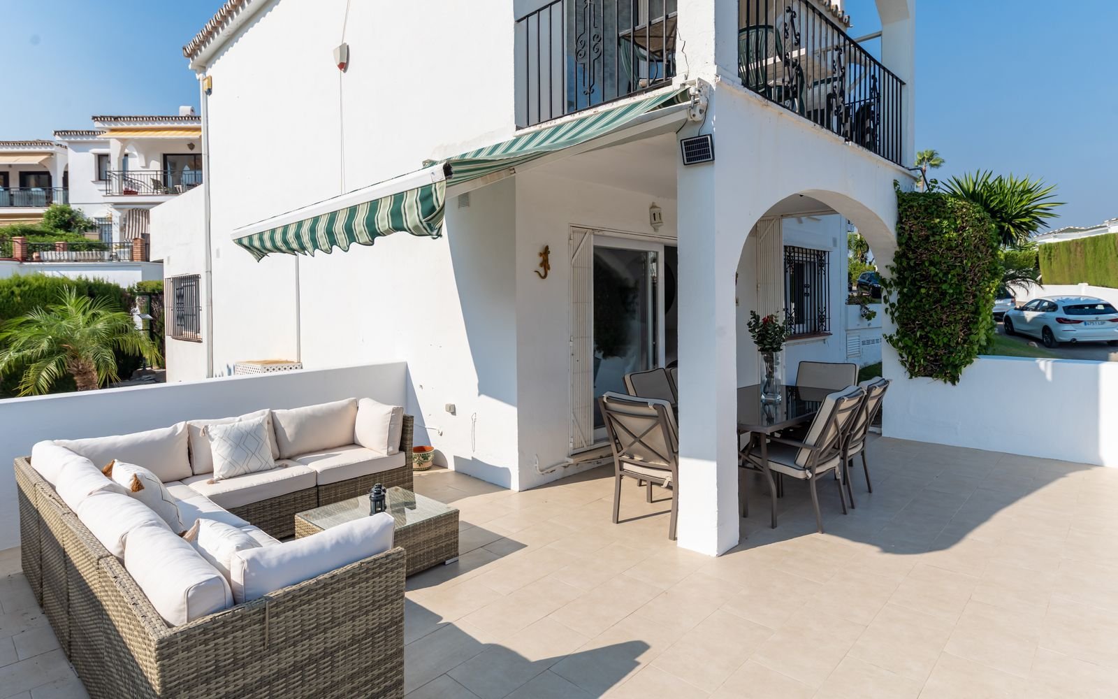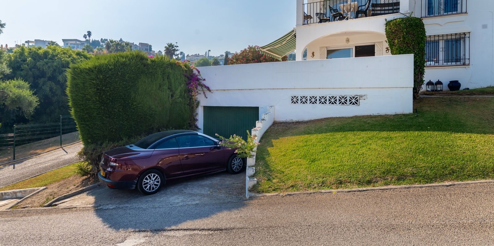 Salonul dispune de feronerie de tip fereastră din perete în perete, oferind vederi către exquisitele grădini tropicale andaluziene și acces la o terasă exterioară complet renovată, închisă și deschisă, cu suficient spațiu pentru mese, bronzat și relaxare. O grădină suplimentară poate fi accesată din terasă, cu trepte care duc direct la garajul proprietății pentru 1 mașină, cu un concourse exterior pentru parcare a unei a doua mașini.