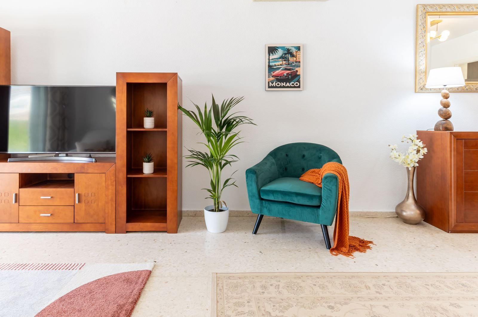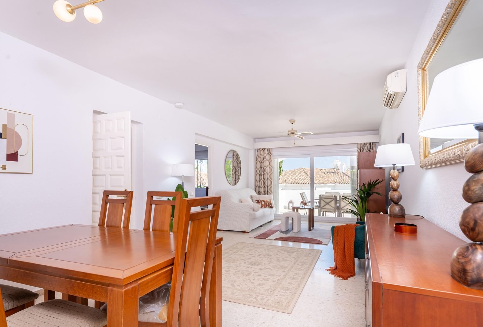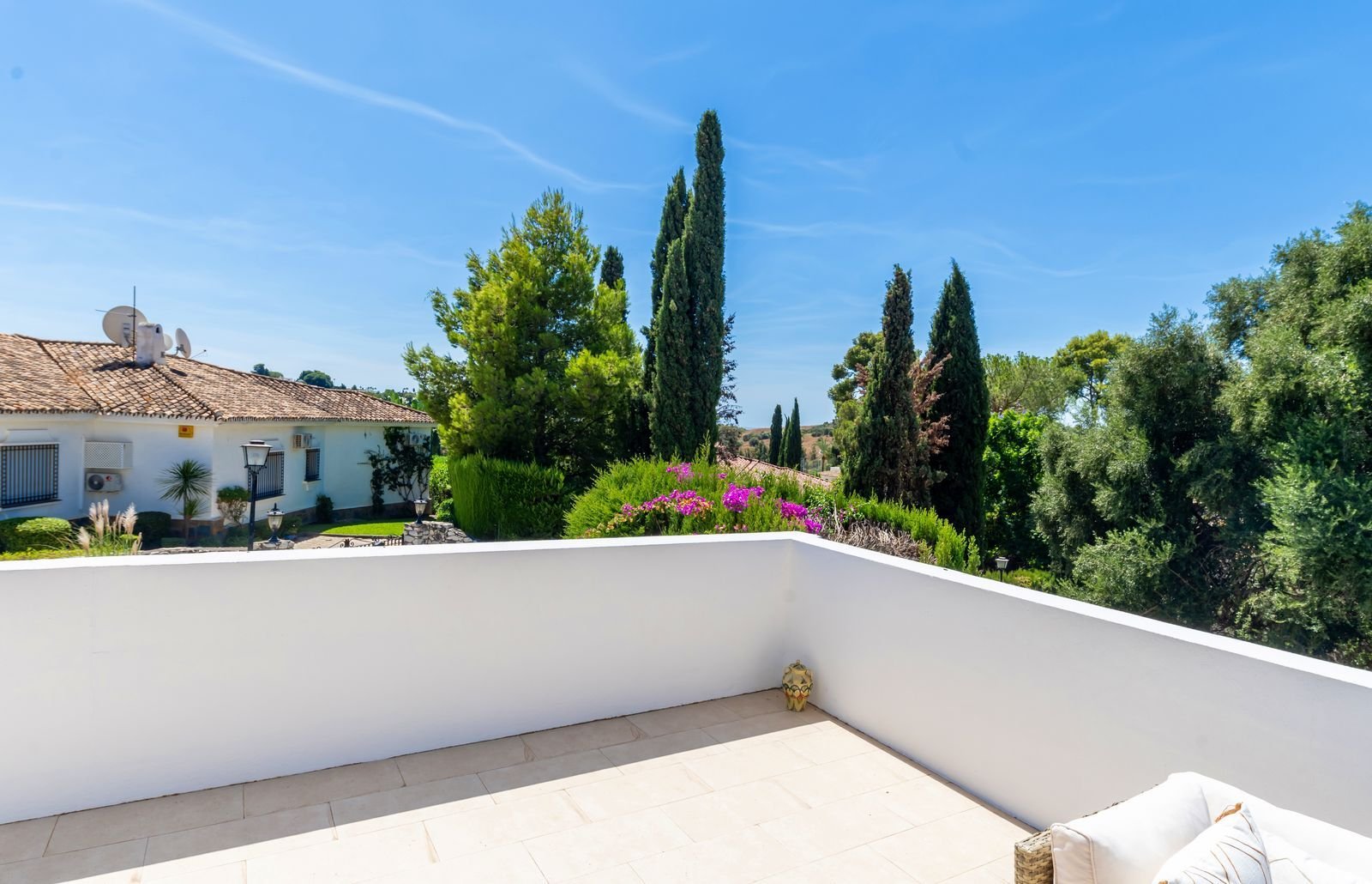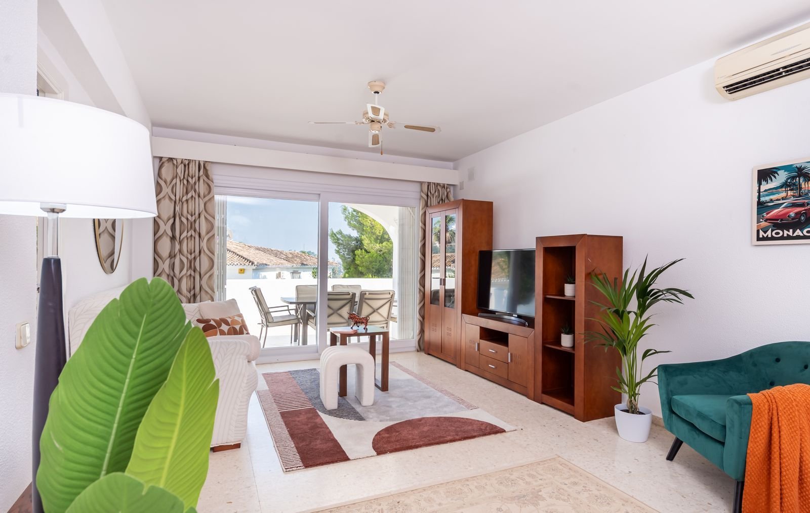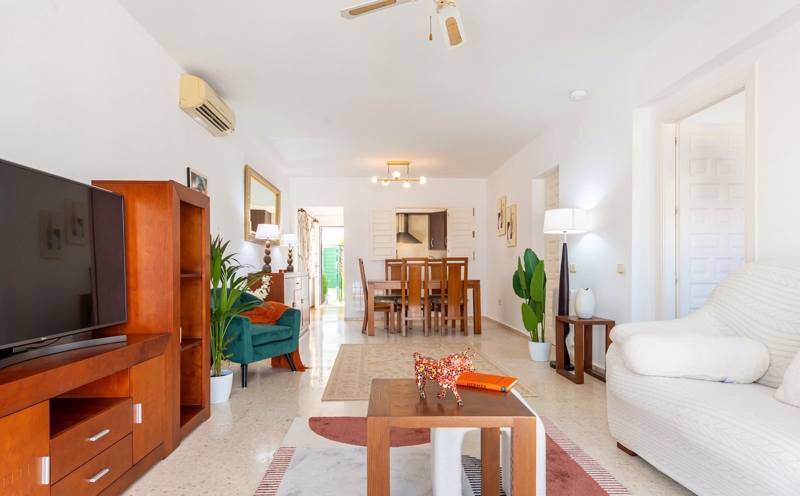 Salonul dispune de feronerie de tip fereastră din perete în perete, oferind vederi către exquisitele grădini tropicale andaluziene și acces la o terasă exterioară complet renovată, închisă și deschisă, cu suficient spațiu pentru mese, bronzat și relaxare. O grădină suplimentară poate fi accesată din terasă, cu trepte care duc direct la garajul proprietății pentru 1 mașină, cu un concourse exterior pentru parcare a unei a doua mașini.