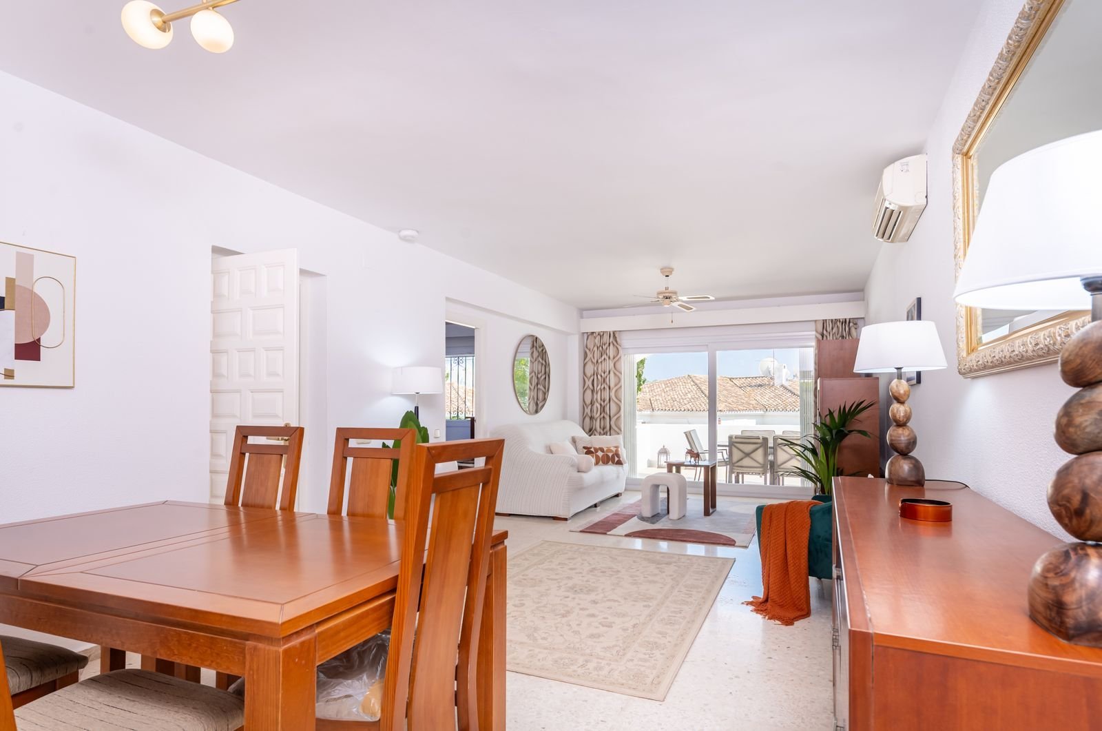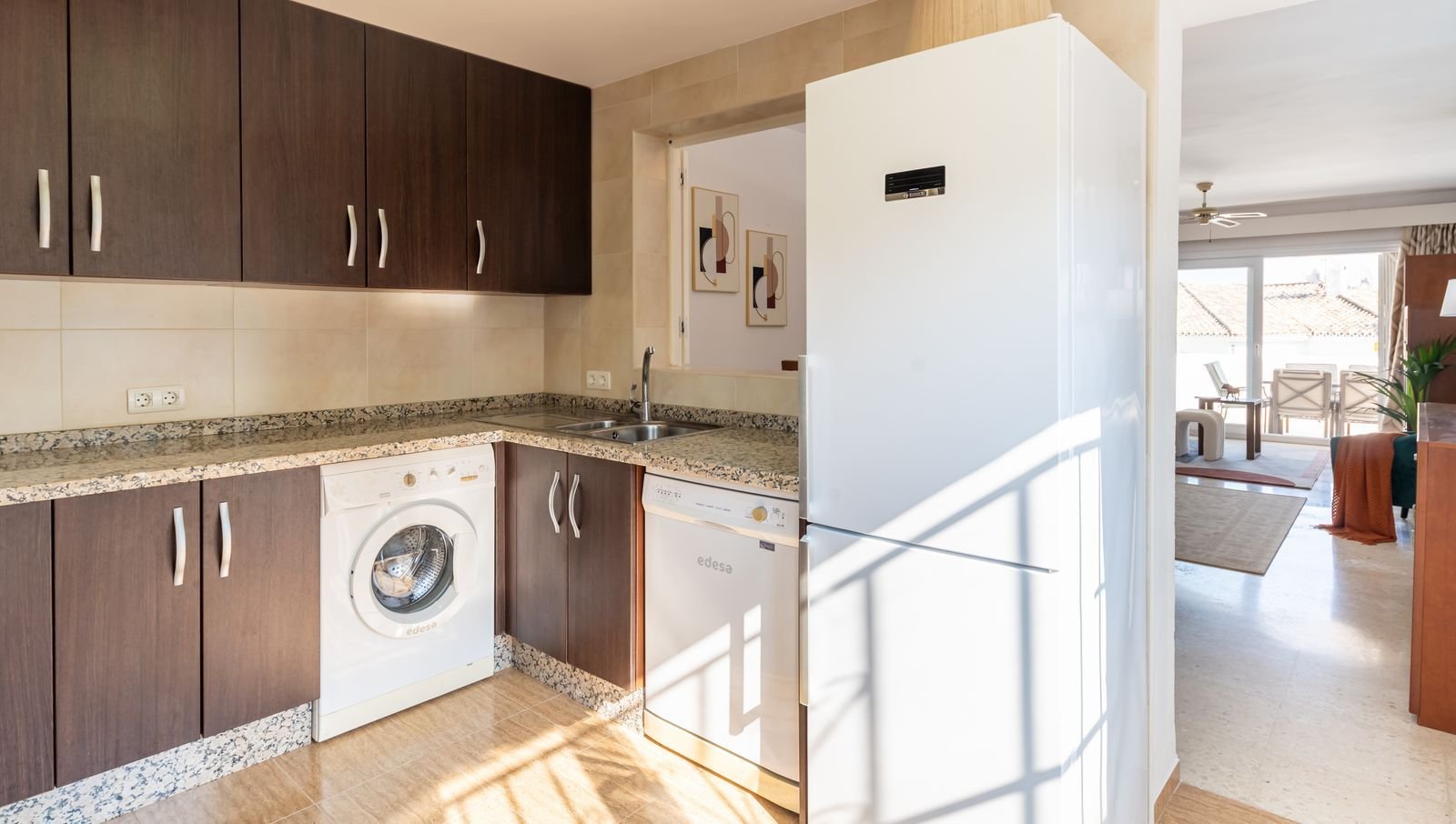 La intrare, o bucătărie semi-deschisă, complet renovată, din stejar închis, dotată cu aparate de înaltă calitate, este situată în fața unui salon / dining remarcabil de spațios, completat cu mobilier contemporan din lemn de acacia și decorațiuni moderne de înalt standard. Feronerie de ultimă generație cu feronerie climatică de grosime triplă este instalată în întreg apartamentul, cu aer condiționat Daikin și ventilatoare electrice de tavan, radiatoare de perete montate, corpuri de iluminat de înalt standard, perdele făcute la comandă, balustrade andaluziene glisante și pardoseală originală din sidef alb crem lustruit.