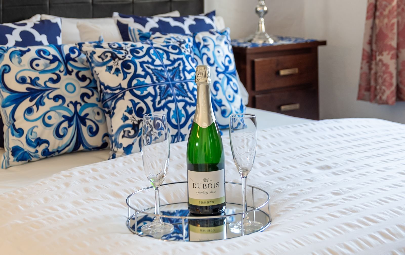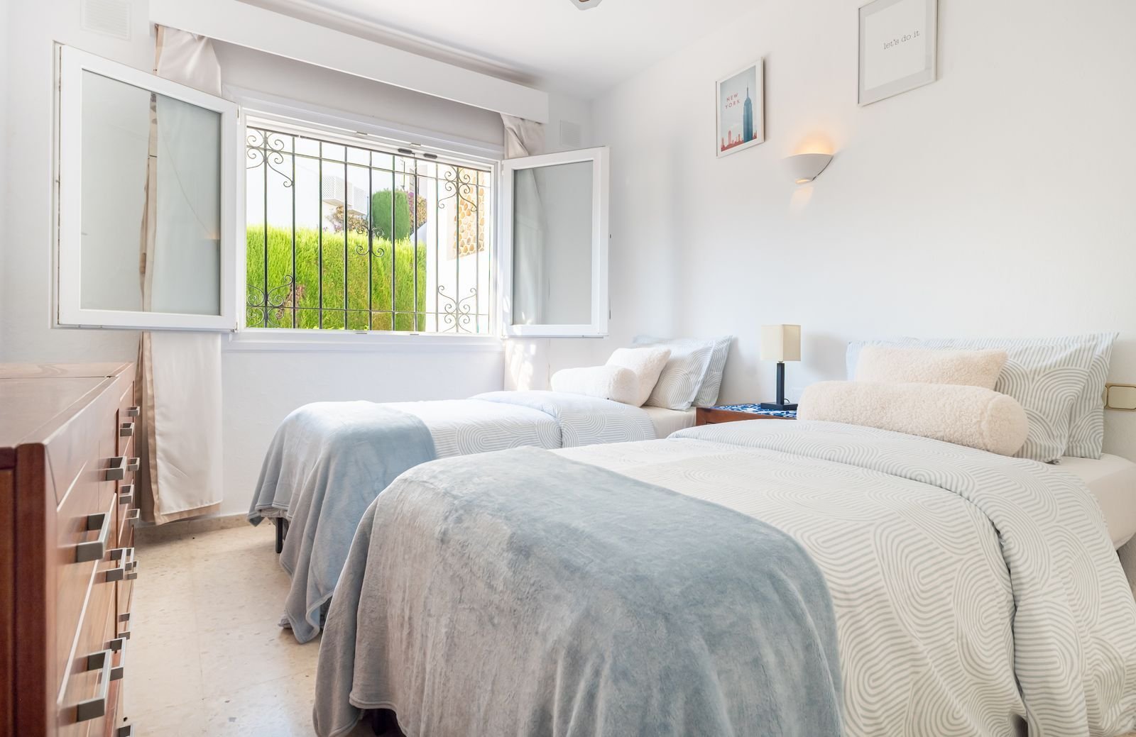Dormitorul dublu pentru oaspeți, adiacent, este dotat cu 2 paturi single, dulapuri cu panouri duble și mobilier din mahon, având vederi către grădinile cu palmieri pline de Bougainvillea.