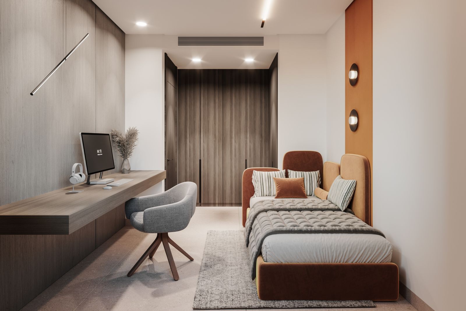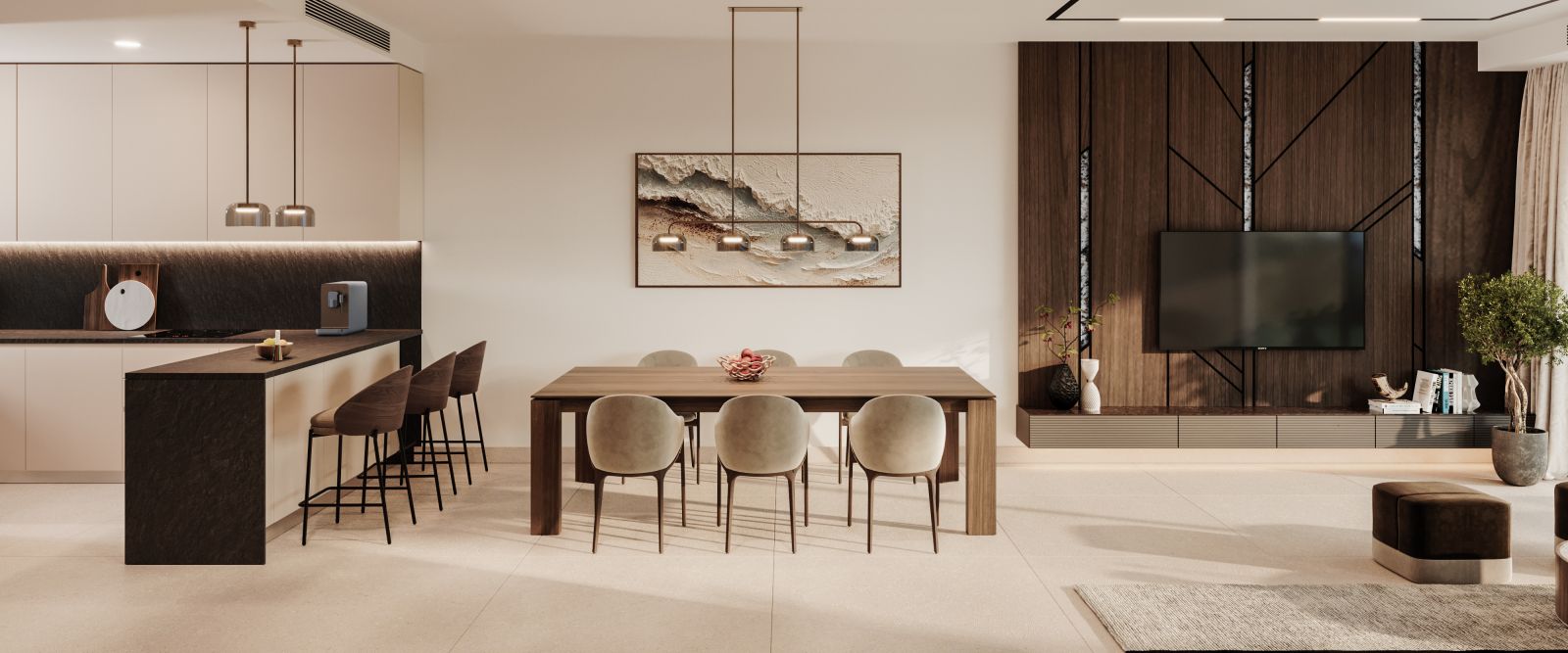 Interioarele sunt concepute cu gândul la confort și funcționalitate. Dormitoarele folosesc materiale moi și tonuri calde, cu un apartament principal care include o baie privată, un dressing și o terasă privată. Două dormitoare suplimentare dispun de dulapuri încorporate și împărtășesc o baie completă cu finisaje neutre și moderne. Zonele de living includ o bucătărie deschisă dotată cu aparate Siemens (cu opțiuni alternative disponibile), un toaletă pentru oaspeți și un spațiu generos de living-dining cu feronerie mari care se deschid direct pe terasă și grădină.