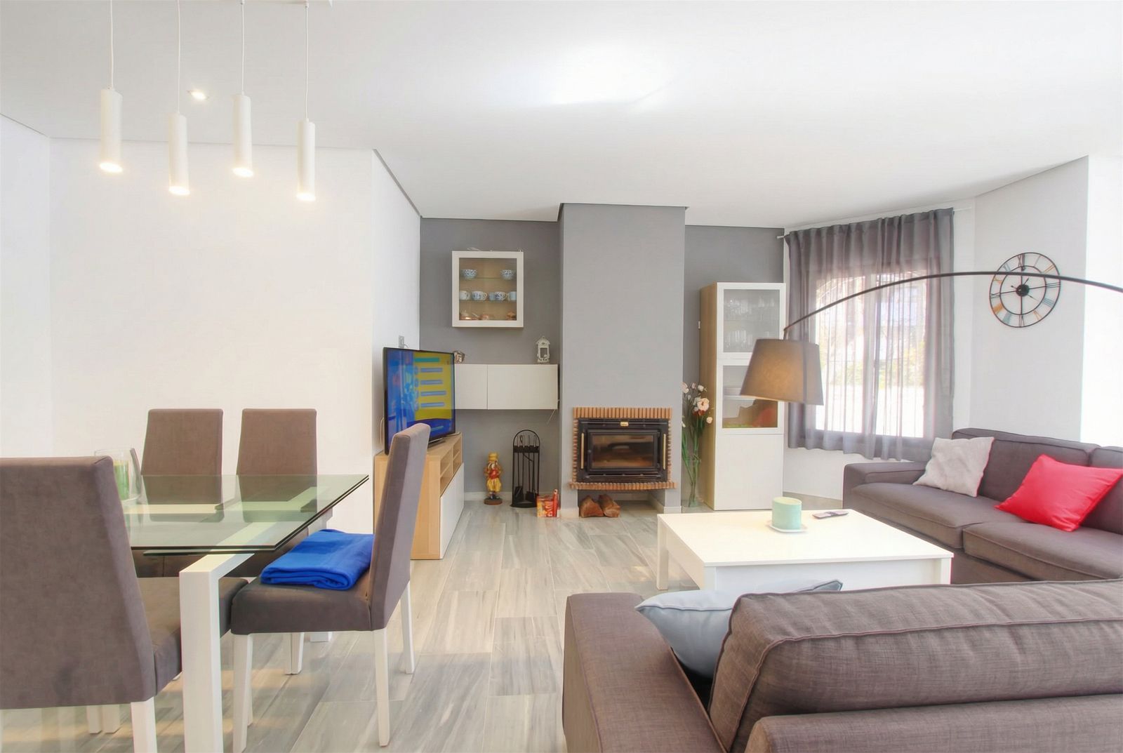 The property features three bedrooms and two bathrooms, a bright living room with floor-to-ceiling windows that open onto a generous terrace with a private Jacuzzi, ideal for relaxing or entertaining. A cozy fireplace in the living area adds a warm touch for year-round living.