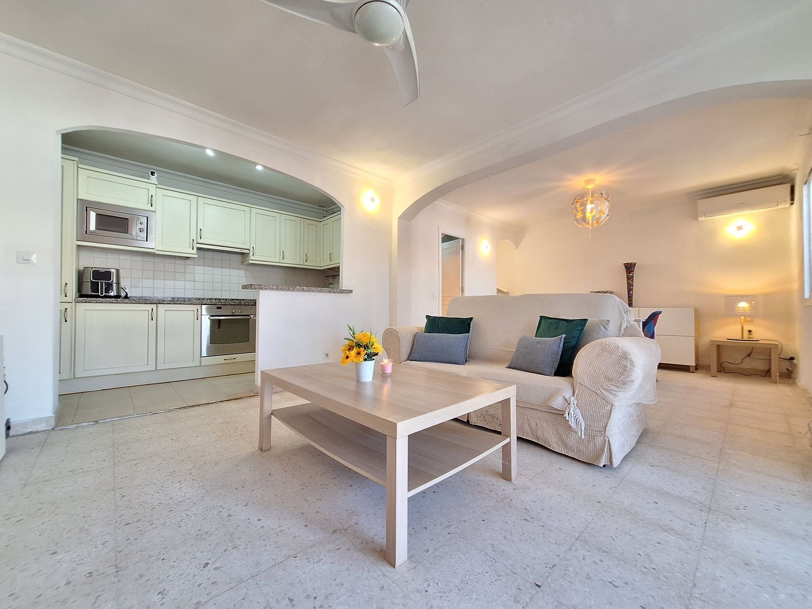 Când intrați în zona de living și dining, aceasta este spațioasă, cu multă lumină naturală. O bucătărie open space cu frigider/congelator, cuptor cu microunde și mașină de spălat vase, și multe spații de depozitare.