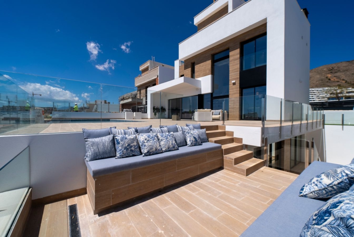 Dezvoltare nouă: Prețuri de la 1.350.000 € la 1.350.000 €. [Dormitoare: 4] [Băi: 5] [Suprafață construită: 446m2 – 460m2]. Acest complex rezidențial este format din mai multe complexe rezidențiale, inclusiv complexul rezidențial cu 17 vile de lux. Fiecare vilă are o vedere panoramică la ocean din orice parte a fațadei sale. Vile cu două etaje, cu solar, grădină interioară cu mezanin mare, piscină infinită și parcare privată. Fiecare vilă este dotată cu lift. Aceste vile sunt excepționale prin designul și facilitățile lor: living spațios, dormitoare mari cu baie proprie la etajul al doilea și solar. Acces direct de la primul etaj la piscina infinită contemporană și terasa mare, un loc idilic pentru a vă petrece vacanțele, a vă relaxa și a vă bucura de apusurile de soare și de priveliștile la mare din Benidorm.