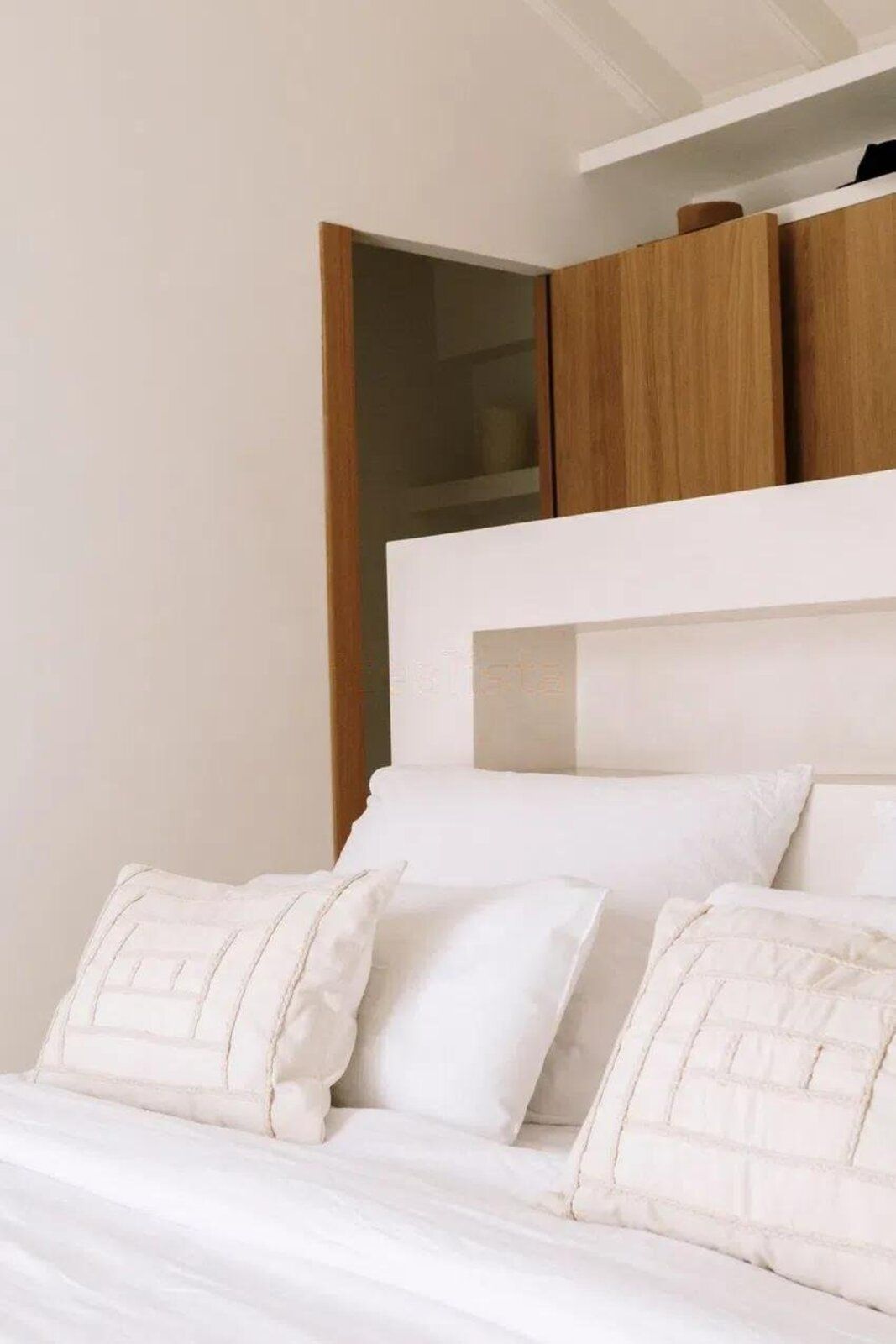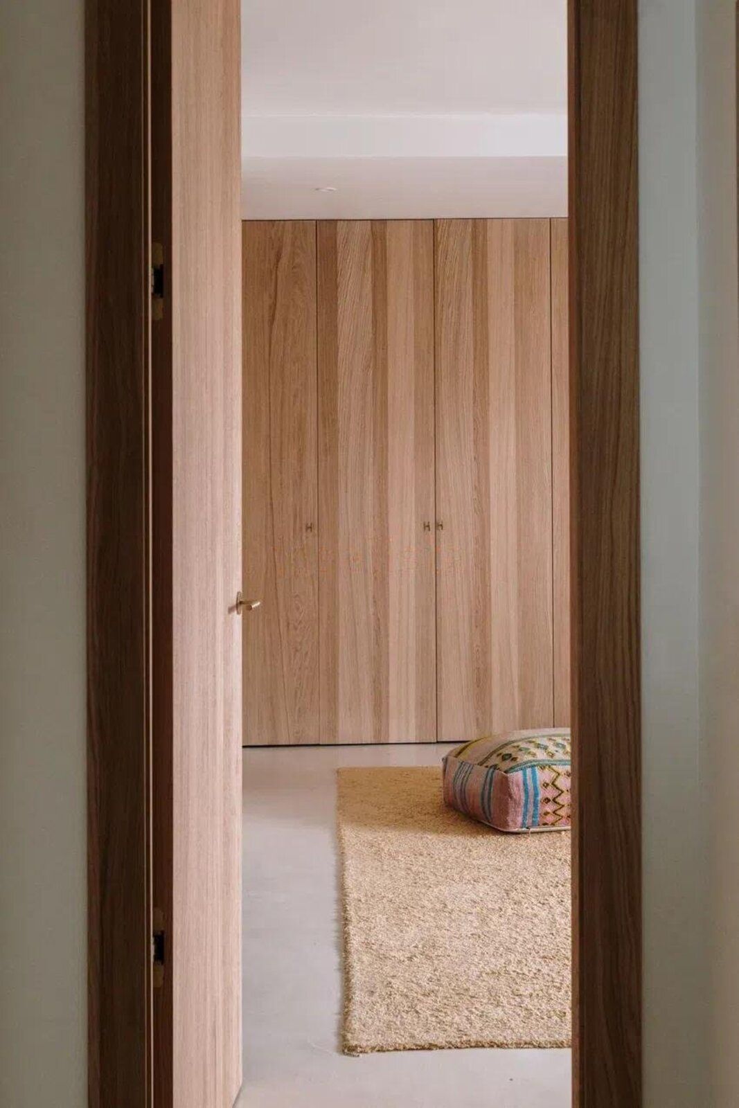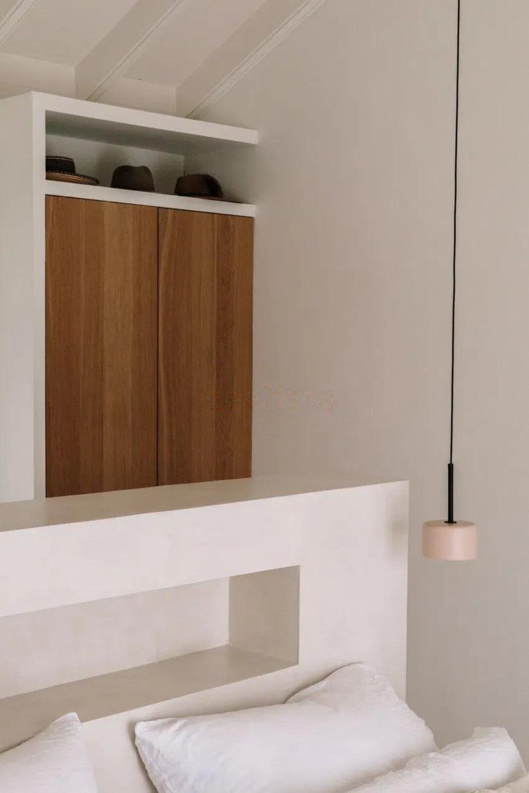 Dormitor principal cu vedere deschisă la La Concha. Bază de pat din microciment și pat dublu de 200×200 cm cu prize electrice integrate. Jaluzele electrice și feronerie cu geamuri duble. Dulapuri încorporate din stejar.