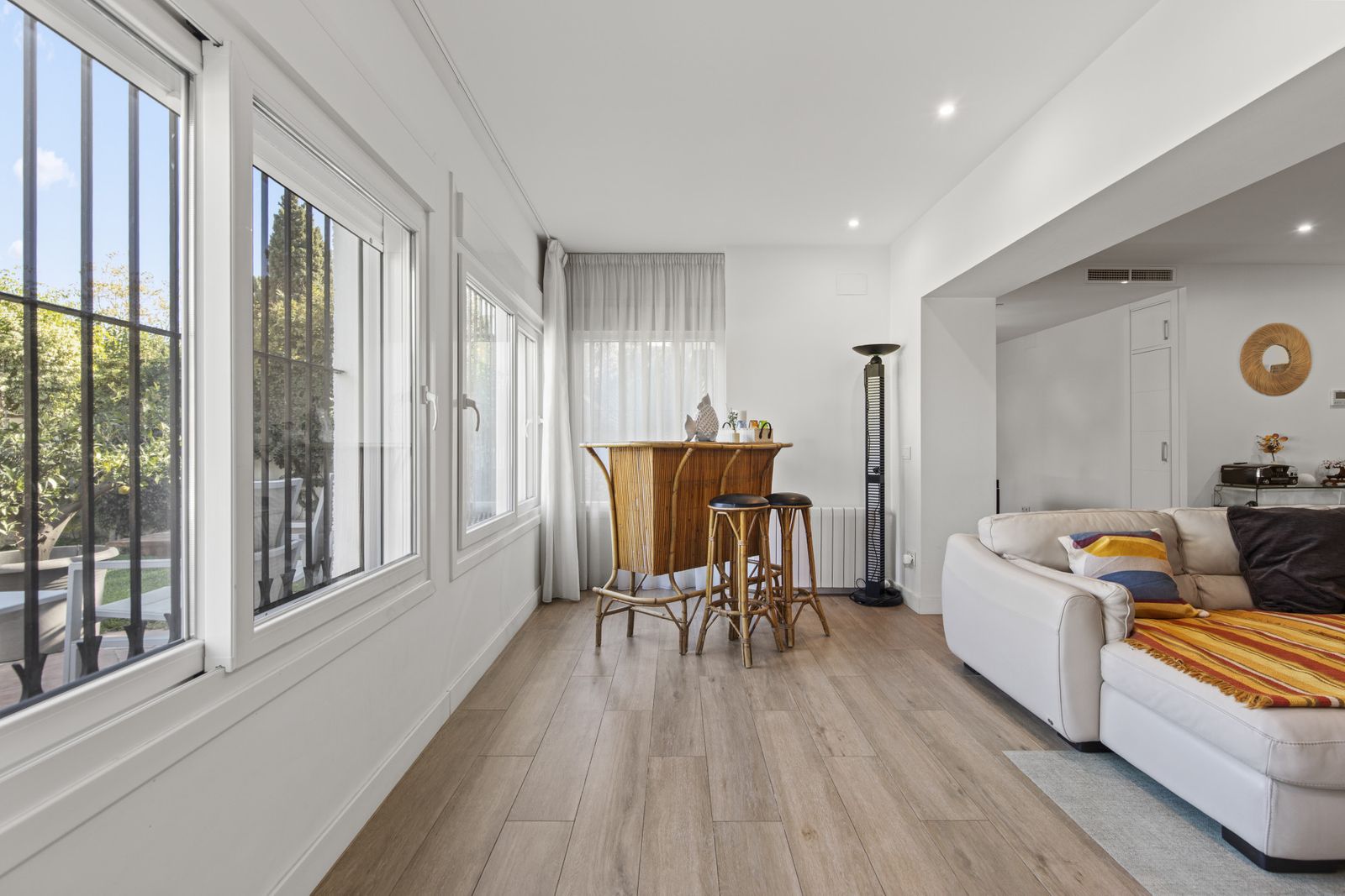 Două dintre cele patru dormitoare beneficiază de băi ensuite, în timp ce toate beneficiază de spațiu de depozitare generos și lumină naturală. Casa este dotată cu încălzire centrală și aer condiționat, asigurând confort pe tot parcursul anului. În exterior, proprietatea continuă să impresioneze cu o terasă acoperită cu plafoane cu grinzi, o terasă pentru soare cu plăci și o grădină mare, privată, orientată spre est—perfectă pentru soarele de dimineață. Piscina împrejmuită oferă liniște sufletească pentru familii, iar zonele exterioare invită la un stil de viață mediteranean relaxat.