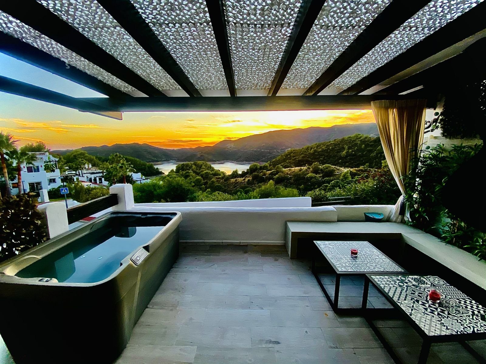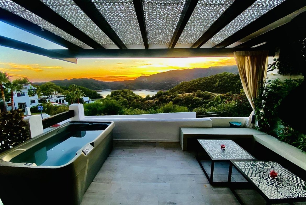 Situată în exclusiva comunitate închisă Zahara de Istán, la doar câteva minute de Marbella, această casă semi-detașată este o adevărată lux pe coasta andaluză. Din momentul în care intri în comunitate, liniștea și intimitatea oferite de acest enclavă sunt imediat evidente. Casa, care se remarcă prin vederile sale incomparabile asupra lacului și munților înconjurători, se deschide către un living spațios și luminos, un spațiu ideal pentru a te bucura de împrejurimile naturale. Bucătăria, deschisă către living, este complet echipată și completată de un șemineu care încălzește întreaga etaj, creând o atmosferă foarte confortabilă. La acest nivel, se află de asemenea o elegantă sală de mese, o baie și o terasă magnifică, de pe care poți savura apusuri de soare de neuitat. Terasa dispune de un jacuzzi și o zonă de relaxare confortabilă, perfectă pentru a te relaxa în aer liber.