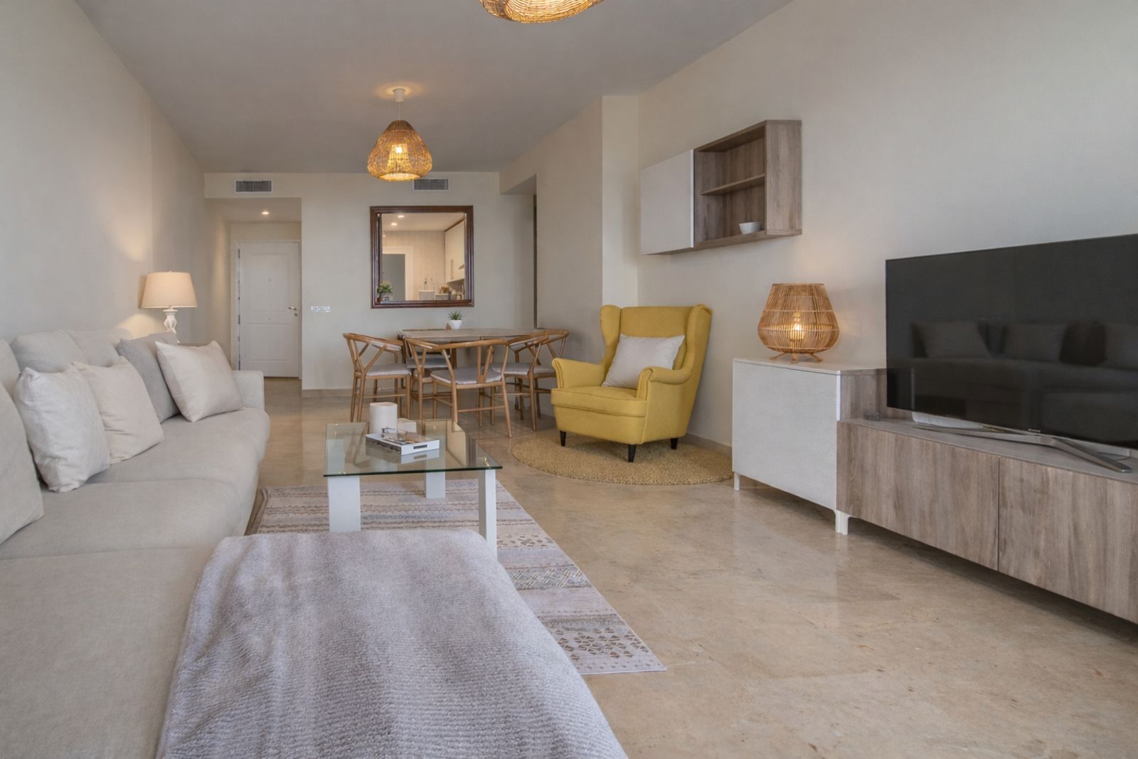 Proprietatea se remarcă printr-o excelentă compartimentare și finisaje de calitate, cu pardoseală din marmură, un living spațios și foarte luminos, cu acces direct la terasă, de unde puteți admira vederea la mare și priveliștea asupra zonelor comune ale dezvoltării. Oferă două dormitoare și două băi, una dintre ele en suite. Bucătăria este funcțională și include o cameră de utilitate/spălătorie separată. Caracteristici suplimentare includ feronerie Climalit cu geamuri termopan, aer condiționat cald/rece prin pompă de căldură și apă caldă furnizată de un boiler electric.