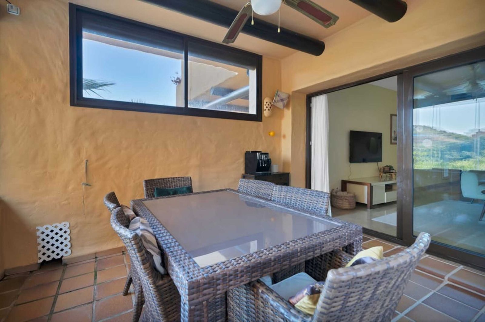 În Manilva, acest elegant apartament cu 3 camere la parter combină confortul, stilul și o locație de neegalat. Situat la distanță de mers pe jos de plajă, școli, supermarketuri și toate facilitățile, oferă, de asemenea, acces rapid la Sabinillas, Puerto de la Duquesa, Estepona și Gibraltar. Apartamentul complet mobilat și gata de mutat are o suprafață construită de 107 m² și o orientare excelentă spre sud-est, oferind lumină naturală pe parcursul întregii zile. Dispune de un living-dining spațios cu acces direct la o terasă mare de 47 m² cu un foișor acoperit, perfect pentru relaxare sau pentru a te bucura de întâlniri plăcute în aer liber. De asemenea, dispune de o bucătărie complet utilată, trei dormitoare (unul cu baie proprie) și două băi complete. Include un loc de parcare acoperit, o cameră de depozitare și aer condiționat central. Complexul oferă mai multe piscine comune, grădini tropicale extinse și un cadru privat și liniștit, ideal pentru locuit pe tot parcursul anului sau pentru închirieri de vacanță. O proprietate impecabilă care se remarcă prin eleganța, confortul și locația excelentă pe Costa del Sol. RECOMANDĂM O VIZITĂ!