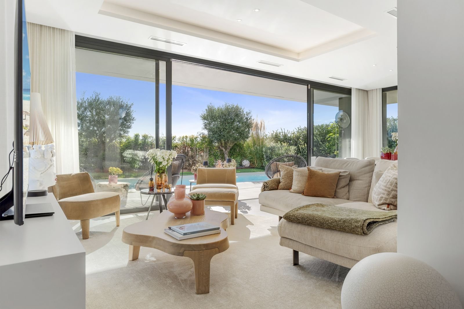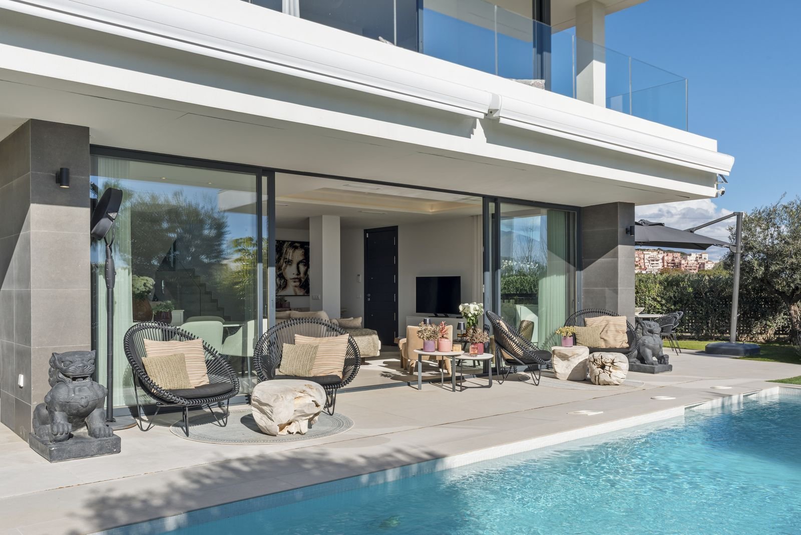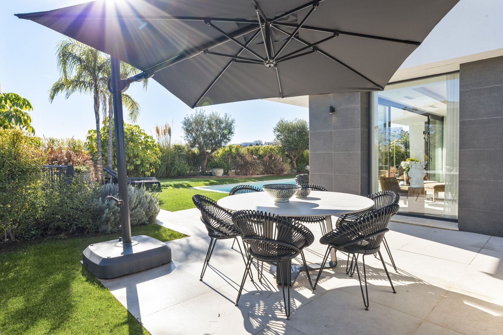 Ușile mari glisante se deschid spre grădina privată, inclusiv terasele.