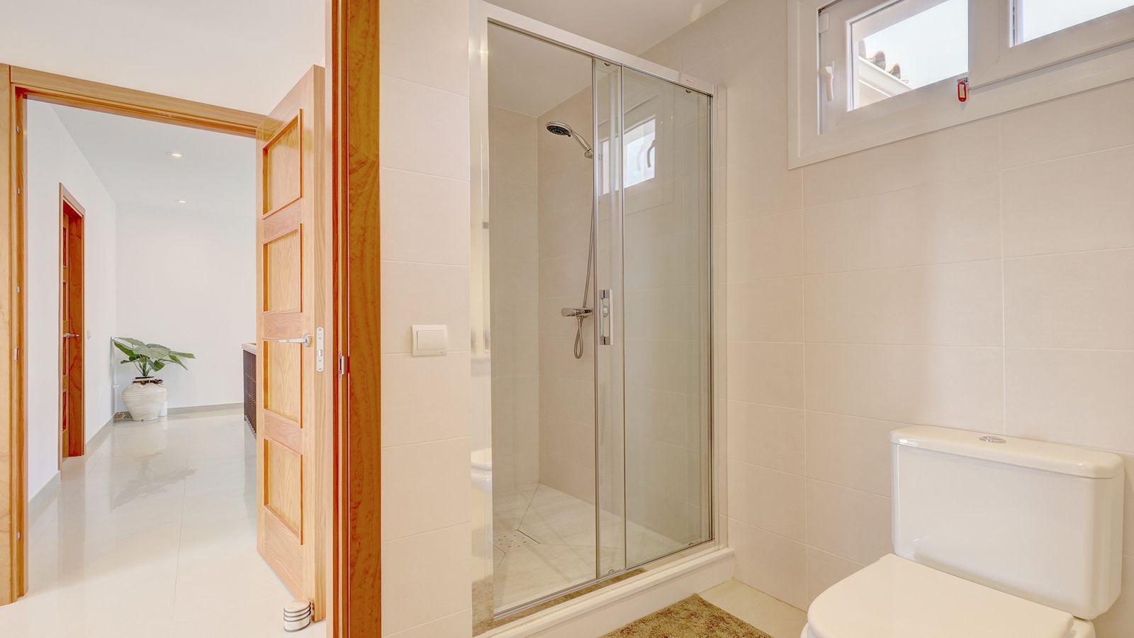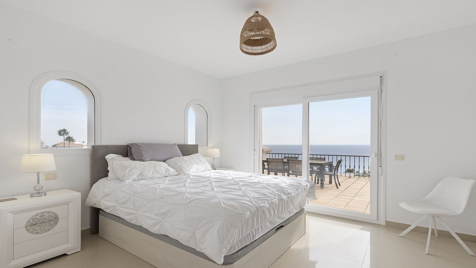 Upstairs are two additional double bedrooms, both ensuite and each with access to a private terrace boasting serene, panoramic sea views. The master bedroom also includes a stylish walk-in wardrobe for added comfort and convenience.