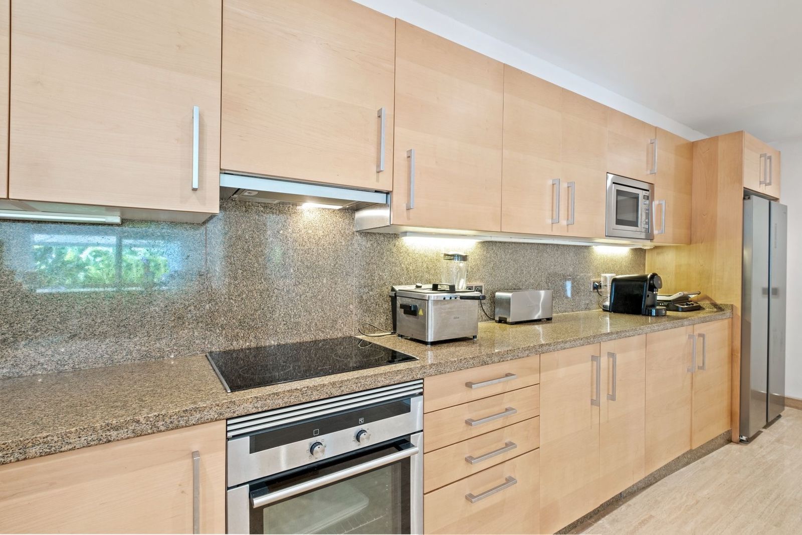 The property boasts a spacious layout of 245 m² with two en-suite bedrooms, a bright open-plan living and dining area, and a modern fully equipped kitchen. Large sliding doors connect the interior to a generous private terrace with a jacuzzi and direct access to lush tropical gardens, creating the perfect setting for entertaining or enjoying the sun all year round.