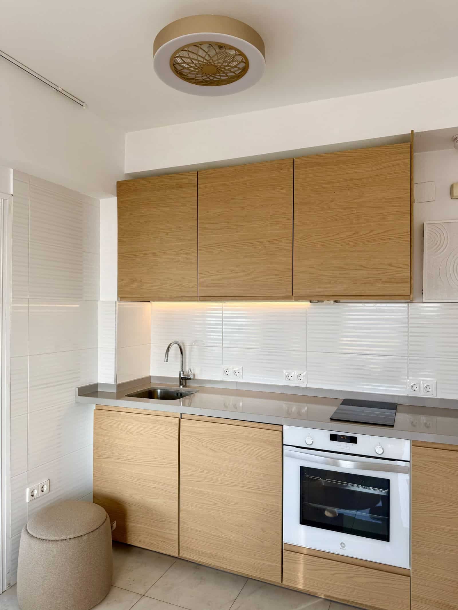 Interiorul dispune de stejar deschis exclusiv, inclusiv dulapuri de bucătărie, dulapuri pentru dormitor și spațiu de depozitare în baie. Apartamentul oferă un dormitor spațios cu vederi atât către mare, cât și către munți, o baie modernă cu mașină de spălat și suport pentru prosoape încălzit, precum și un toaletă separată pentru oaspeți. O parcare publică este situată direct în spatele clădirii, convenabilă pentru oaspeții care sosesc cu mașina.