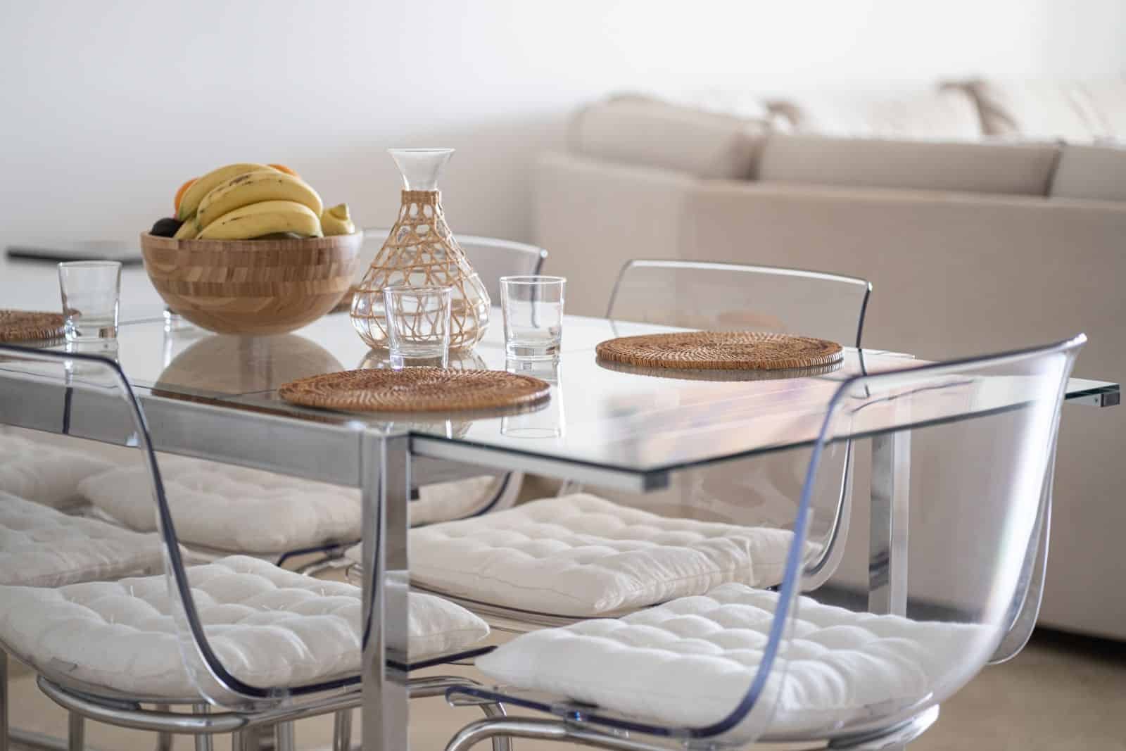 Apartamentul dispune de un spațiu de living și dining luminos, în plan deschis, conectat fără întreruperi cu o bucătărie nouă, complet echipată. Spațiul de locuit se deschide către o terasă mare acoperită cu o masă de dining suplimentară, perfectă pentru mese în aer liber, care se extinde într-o grădină privată luxuriantă cu șezlonguri și vederi parțiale la mare.