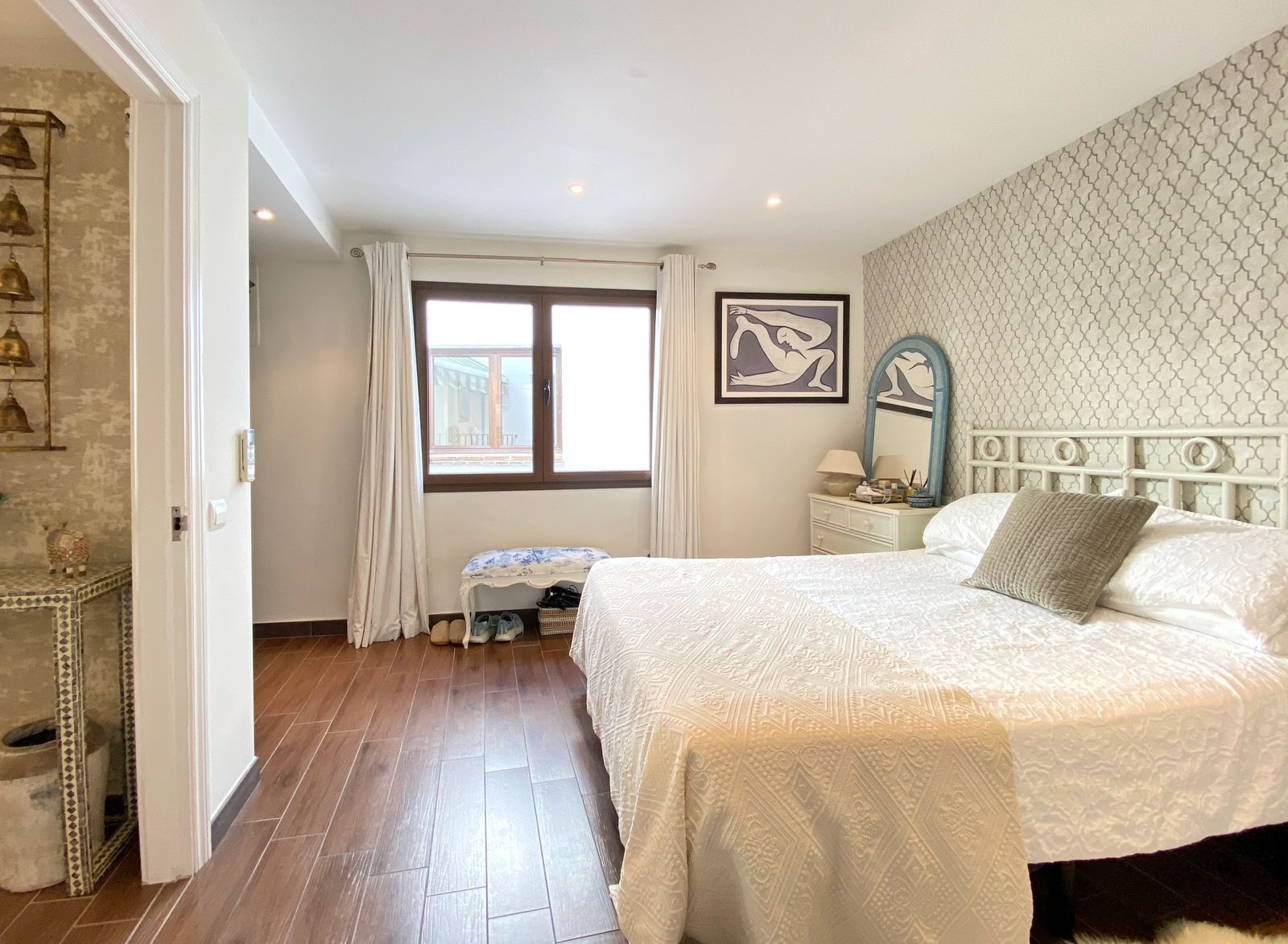 On the upper floor, there is an impressive living-dining room with balconies overlooking the street and another small balcony overlooking the house's interior courtyard. A modern kitchen with a central island. And two double bedrooms, both with en-suite bathrooms.