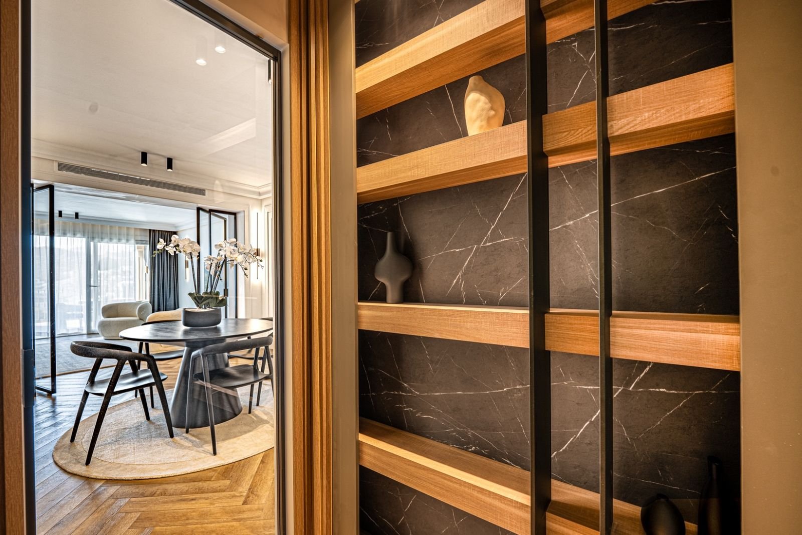 Casa înșiruită dispune de un spațiu de living și dining deschis, cald și modern, cu accente din lemn. O terasă mare se extinde din living, iar toate dormitoarele au terase private. Bucătăria complet utilată este concepută atât pentru stil, cât și pentru practicitate. Interiorul este luminos și contemporan, combinând confortul cu un design atemporal.