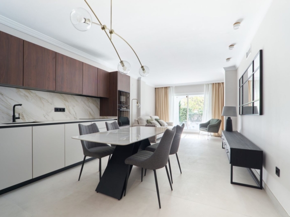 This modern and bright apartment has been completely renovated to the highest standards, offering a stylish and open layout. The spacious living and dining area seamlessly connects to the contemporary Gaggenau kitchen, creating an ideal space for both everyday living and entertaining. Large windows fill the home with natural light and open onto a generous terrace boasting breathtaking panoramic views over Marbella, the Mediterranean Sea, and the surrounding mountains.