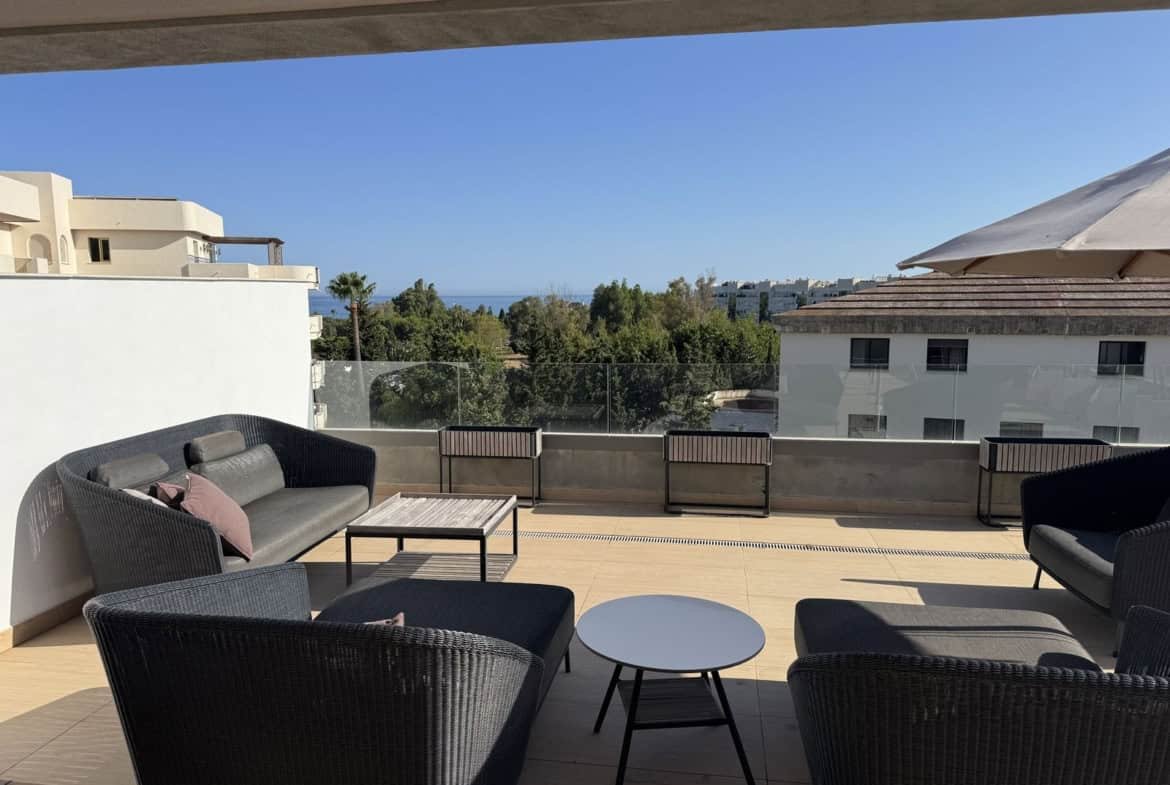 Un penthouse duplex cu 3 dormitoare, plin de lumină, în stil scandinav, situat într-o nouă dezvoltare, la doar câțiva pași de portul animat Puerto Banús.