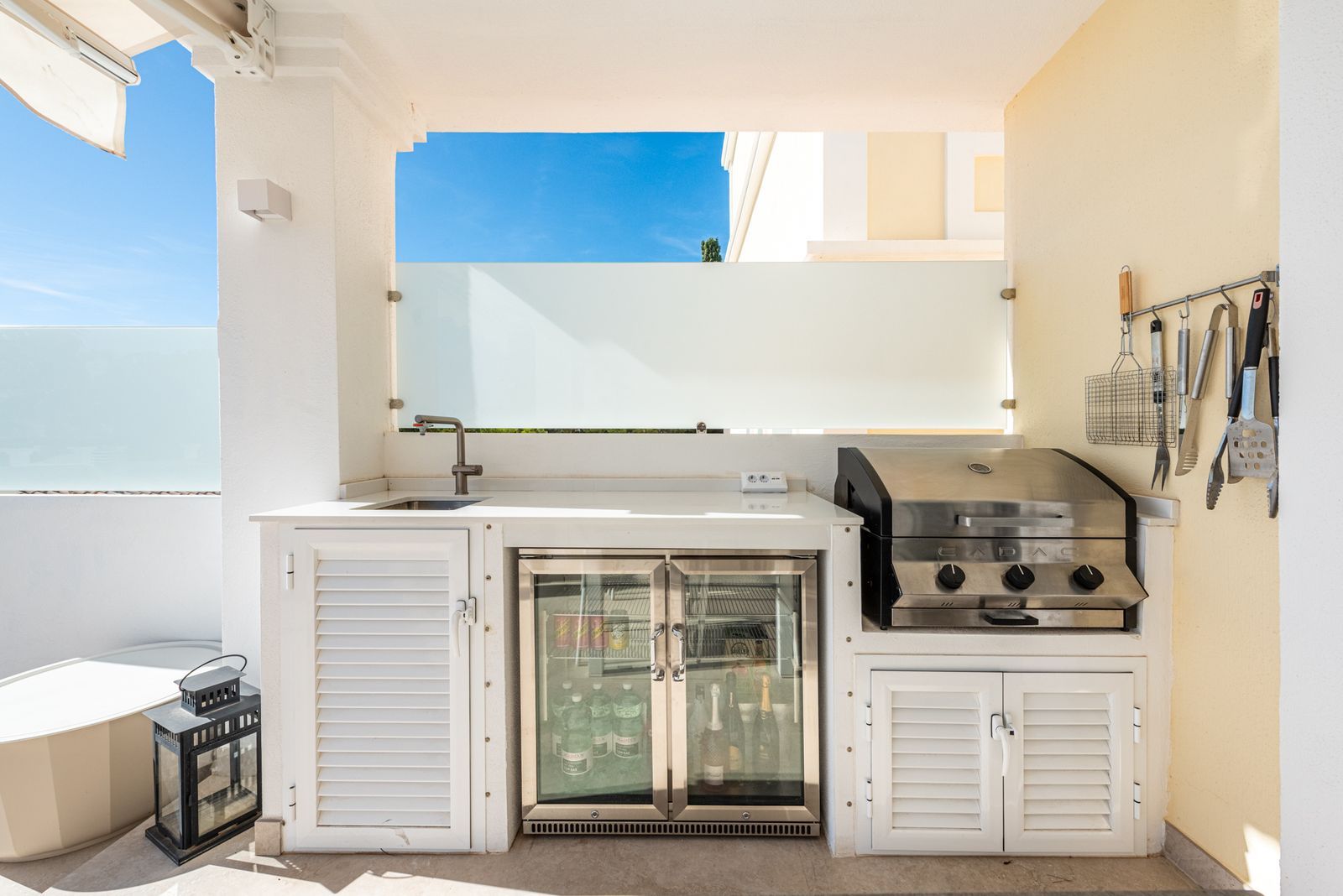 Urcând la al treilea nivel, magnificul solarium de pe acoperiș servește drept bijuterie a casei. Acest spațiu luxos oferă un jacuzzi, o saună și o bucătărie în aer liber complet echipată, toate având ca fundal vederi panoramice asupra Nueva Andalucía și Mării Mediterane, un decor spectaculos atât pentru relaxare pe timpul zilei, cât și pentru întâlniri la apus.