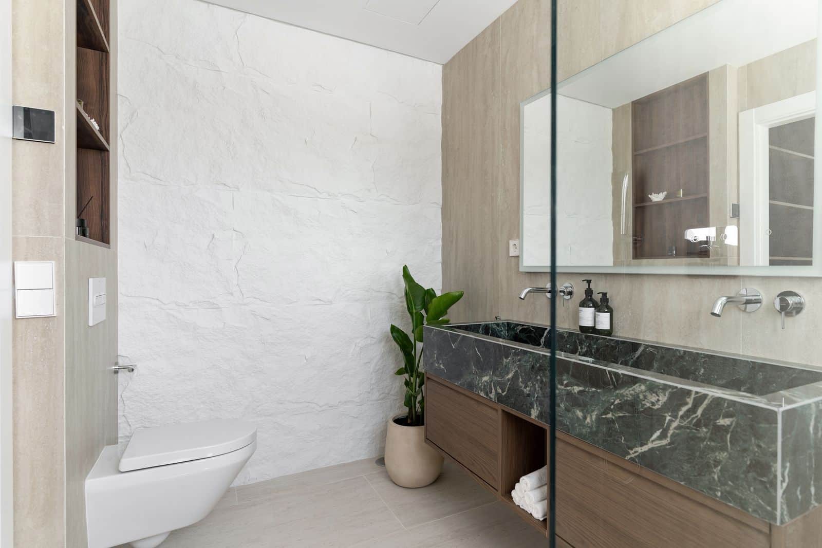 Zona de zi de la etajul principal, cu bucătărie, dining și living open-plan, se deschide direct către o terasă generoasă orientată spre sud, perfectă pentru dimineți lente sau cine sub stele. Bucătăria dispune de blaturi elegante din marmură italiană și un bar de vin încorporat, în timp ce un dormitor pentru oaspeți cu baie proprie și terasă proprie oferă intimitate și confort vizitatorilor.