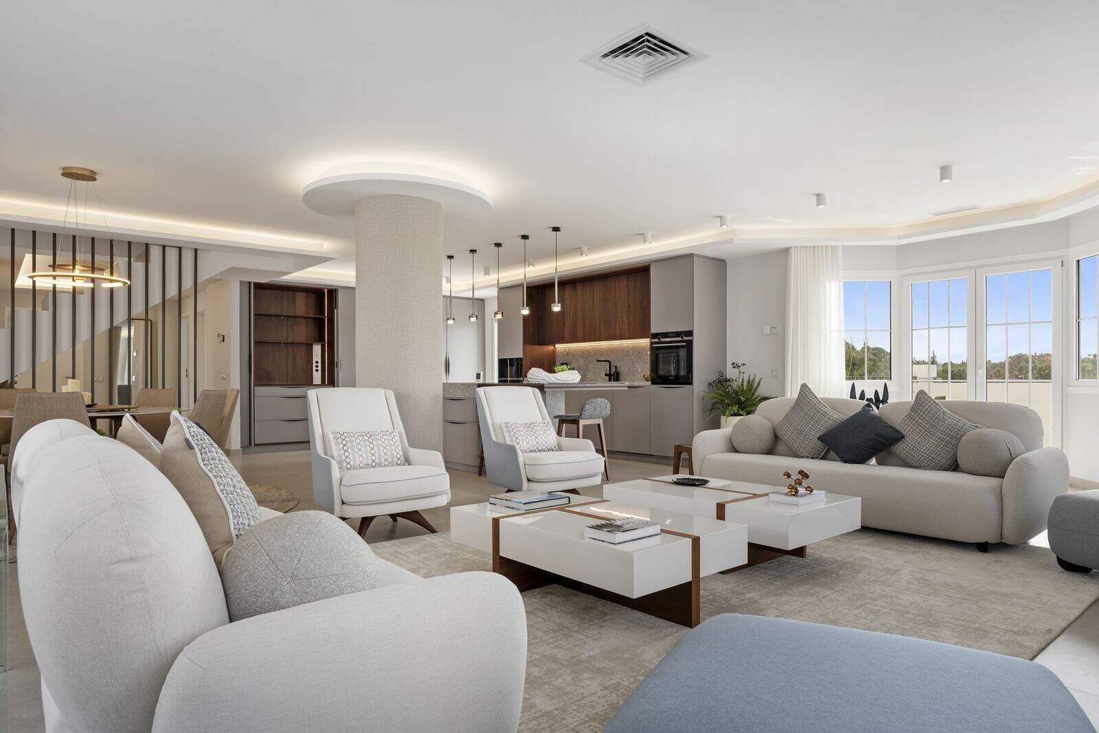 Livingul cu plan deschis este inundat de lumină naturală din trei direcții, creând o atmosferă spațioasă și elegantă. Bucătăria personalizată din nuc și porțelan—echipată cu aparate premium Siemens, frigidere duble, răcitor de vinuri și sistem de filtrare a apei—formează inima casei, curgând fără întrerupere în zonele de dining și living. Iluminatul inteligent și materialele atent selectate îmbunătățesc impresia sofisticată de ansamblu.