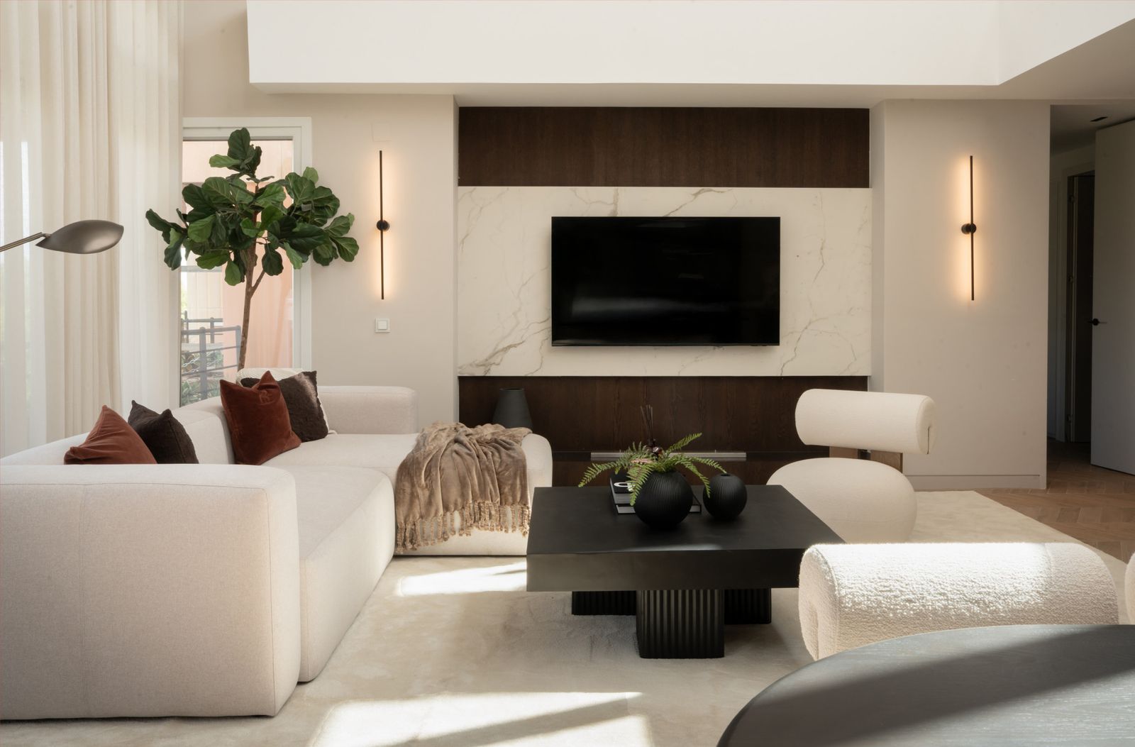 The interior is defined by double-height ceilings and a bright open-plan layout, where the living, dining, and kitchen areas flow seamlessly together. Every element has been carefully redesigned, featuring sleek modern finishes, a stylish open-plan kitchen, and underfloor heating in the bathrooms, ensuring year-round comfort. Sold fully furnished, the penthouse is presented in excellent condition and is ready for immediate occupancy.
