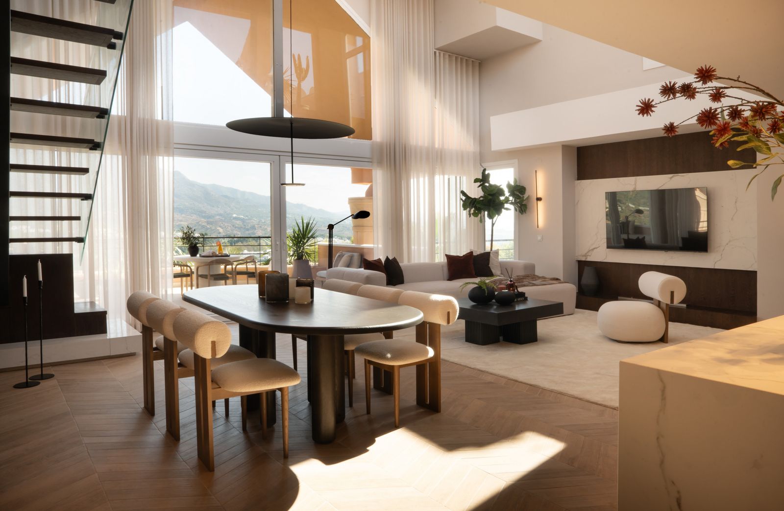 Situat în prestigioasa comunitate închisă Magna Marbella, acest penthouse superb renovat oferă o combinație rară de eleganță contemporană, confort și peisaje uluitoare. Beneficiind de securitate 24 de ore și o poziție înaltă, proprietatea se mândrește cu vederi panoramice neîntrerupte asupra Mării Mediterane, munților înconjurători și terenului de golf îngrijit – un cadru cu adevărat excepțional pentru o viață rafinată.
