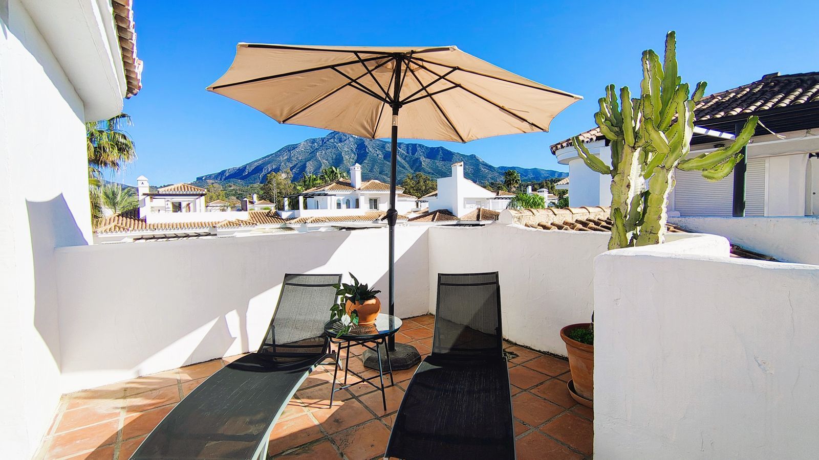 Etajul Principal: Dispune de 2 dormitoare duble plus un dormitor suplimentar, perfect pentru o cameră de copii sau birou acasă. Include 2 băi complete și o terasă foarte mare cu vedere spre sud, ideală pentru a te bucura de soarele din Marbella pe parcursul întregii zile.
