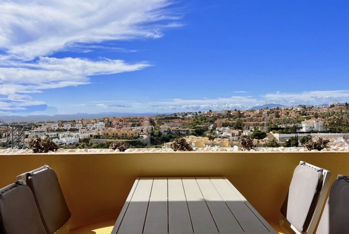 Apartament spectaculos cu vedere la golf și ocean, situat la 2 minute de clubhouse-ul Miraflores. Dispune de o terasă mare, două dormitoare și două băi, o bucătărie open-space și se vinde cu un loc de parcare și o cameră de depozitare. Complexul dispune de două piscine comune și grădini.