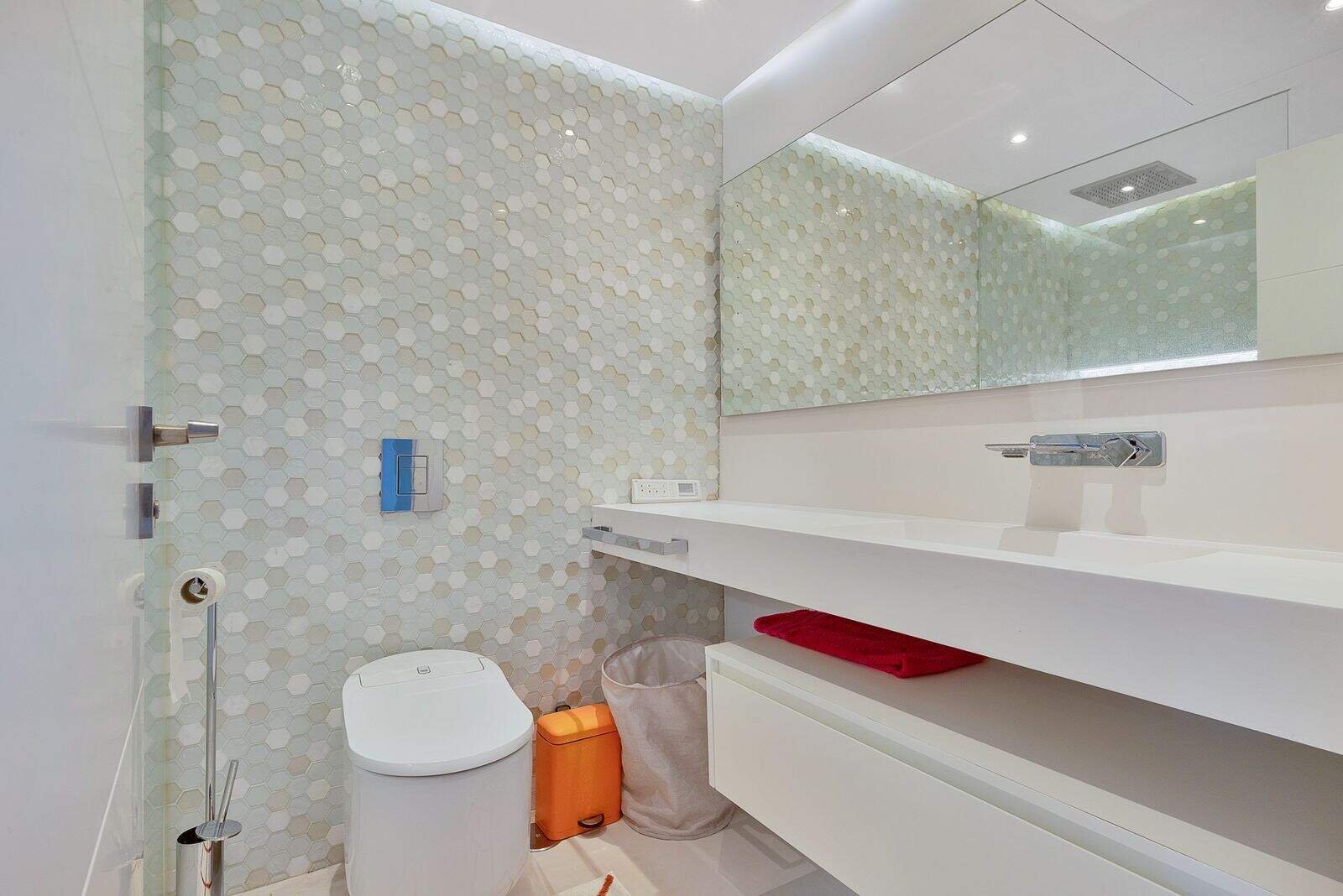 Recent modernizată la cele mai înalte standarde de lux modern, proprietatea vă întâmpină cu o bucătărie parțial renovată, echipată cu aparate de ultimă generație și o cameră utilitară integrată, perfectă pentru o viață cotidiană fără probleme. Livingul spațios și una dintre camerele de oaspeți se deschid către terasa de la nivelul principal, oferind un cadru liniștit pentru a vă bucura de vederile grădinii verzi.