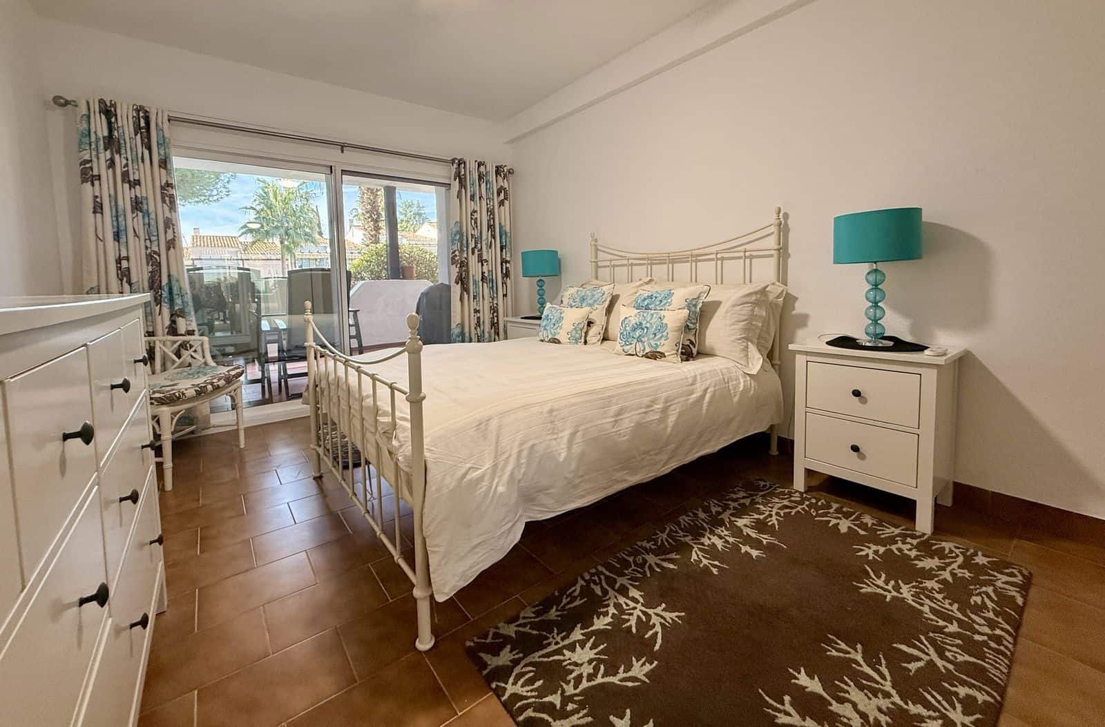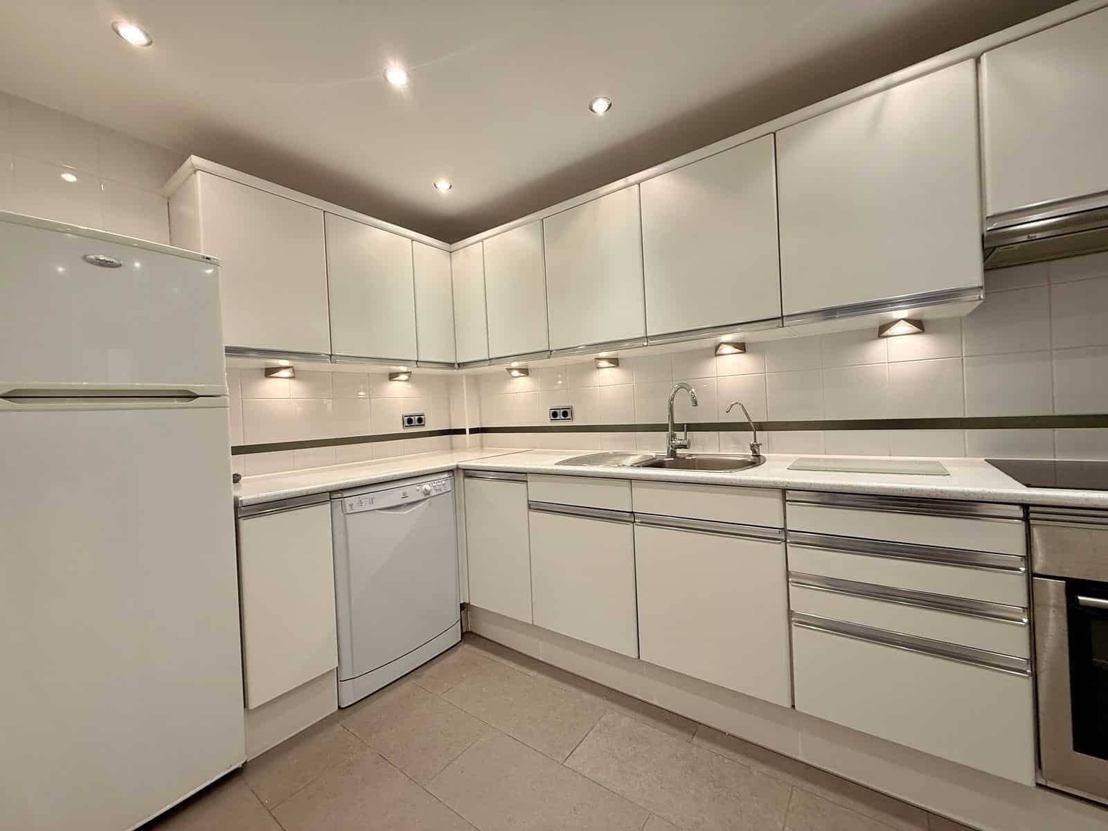 Apartamentul dispune de o terasă acoperită spațioasă care oferă o excelentă intimitate și vederi panoramice minunate asupra grădinilor pline de palmieri, cu munții ca fundal pitoresc. Interiorul cuprinde un hol de intrare primitor, o bucătărie bine dotată, complet echipată, și o cameră utilitară separată cu mașină de spălat și uscător. Bucătăria este convenabil situată lângă zona de living și dining open-plan, care se deschide direct către terasa principală—perfectă pentru mese în aer liber, relaxare și bronzat.