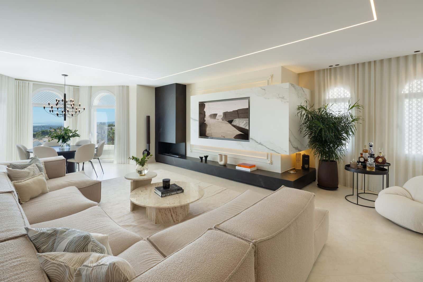 Recent renovat, penthouse-ul se întinde pe două niveluri și prezintă un total de patru dormitoare spațioase, fiecare cu propriul său baie privată. Interiorul este definit de un concept de design modern care subliniază linii curate, finisaje premium și o paletă de culori naturale. În centrul casei, un living deschis se leagă de o bucătărie elegantă Gaggenau, cu dulapuri din lemn bogat, blaturi din marmură lustruită și accente de microciment care creează un echilibru între căldură și minimalism. Planul a fost atent gândit pentru a maximiza atât confortul, cât și practicitatea, asigurându-se că fiecare cameră se simte conectată, menținând în același timp intimitatea.
