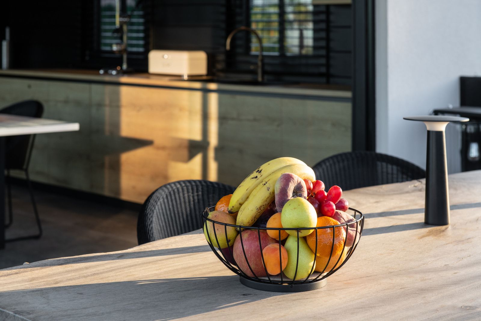 În aer liber, fiecare spațiu a fost conceput pentru a trăi în armonie cu soarele. Piscina infinită se deschide către un orizont magnific, în timp ce terasa principală dispune de mai multe zone de lounge: șezlonguri, zone de relaxare umbrite și o zonă de dining în aer liber cu grătar Yakiniku. Grădina privată, perfect întreținută, întărește această atmosferă serenă.