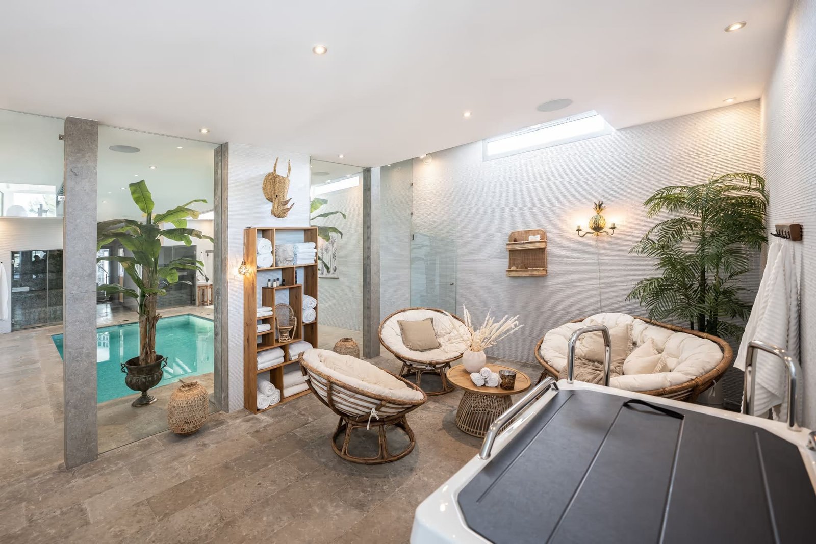 Proprietatea fabuloasă, cu mai multe niveluri, oferă 5 dormitoare cu baie proprie și vedere la mare, 7 băi și 2 toalete pentru oaspeți. Veți avea parte de luxul și confortul oferite de facilitățile precum solariumul cu jacuzzi, piscinele încălzite cu apă sărată atât interioară, cât și exterioară, sauna, baia turcească, pivnița de vinuri, sala de gimnastică, etc.